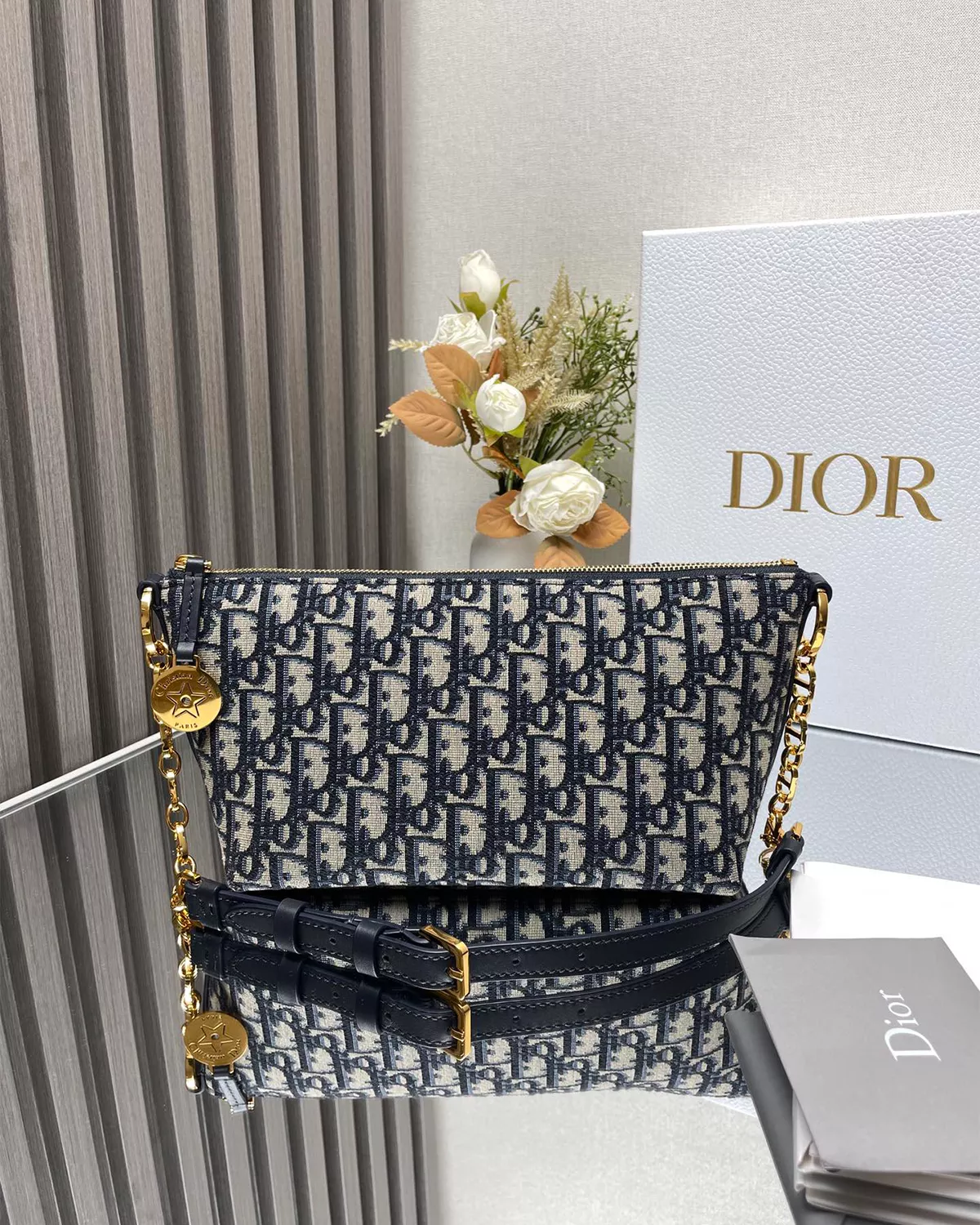 The Blue Jacquard Hobo Bag with Chain Strap blends contemporary style with functional design. Crafted in a signature blue jacquard fabric with smooth leather accents, it features a soft, relaxed silhouette ideal for everyday wear. The spacious compartment is secured with a smooth zip closure enhanced by a medallion charm engraved with a star motif, adding a refined touch.