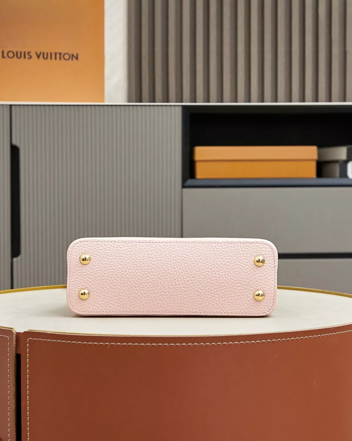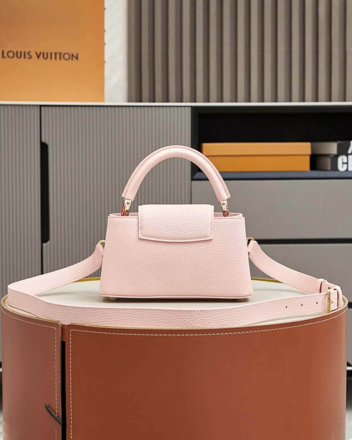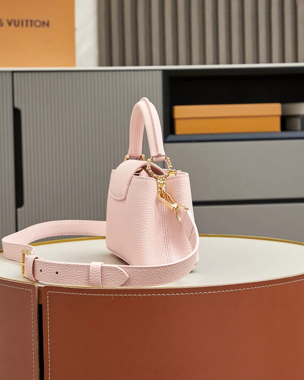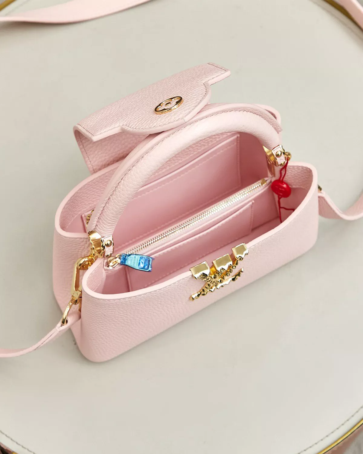 The Capucines Mini “Rose Jasmin Pink” embodies refined elegance in a compact silhouette. Crafted from luxurious Taurillon leather in a soft yet vibrant Rose Jasmin Pink hue, this timeless handbag is elevated with gleaming gold-tone handle rings and the House’s iconic LV Initials.