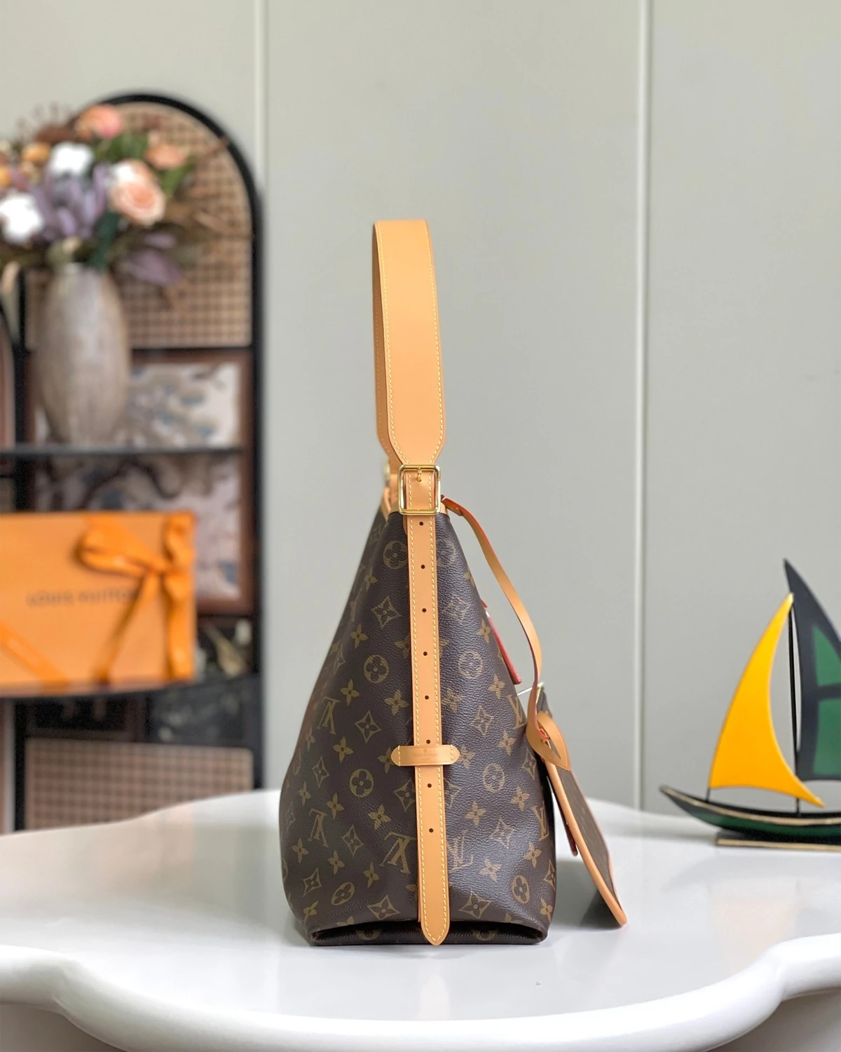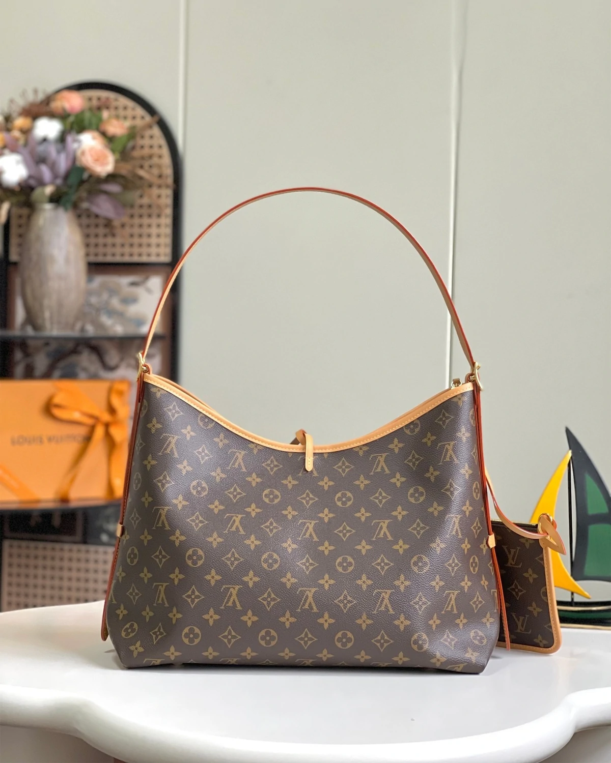 The CarryAll MM handbag in Monogram canvas with natural leather trim. Its contemporary, body-friendly design and roomy interior make this a fantastic everyday bag. Inside zipped pockets and a removable zipped pouch deliver even more functionality. A gold-color buckle allows the handle to be shortened or lengthened.