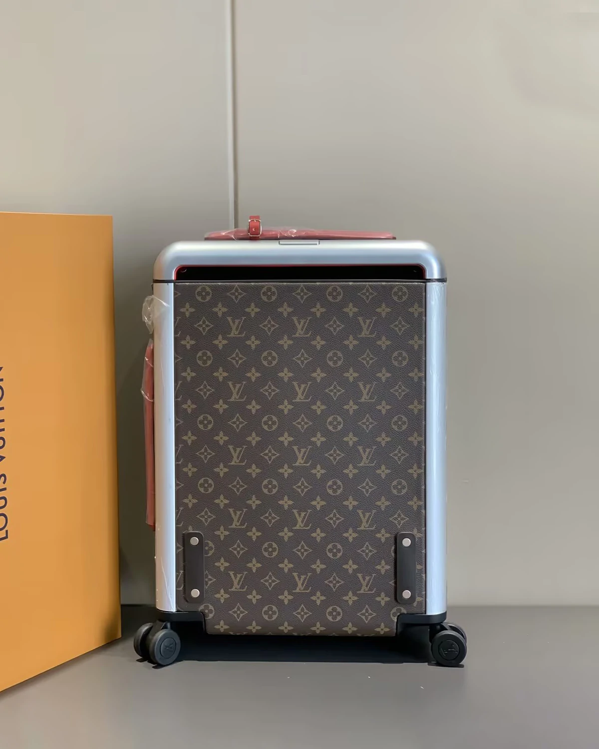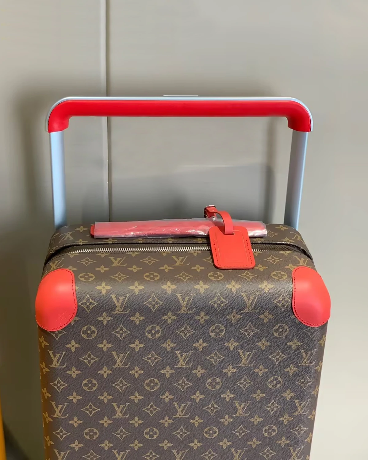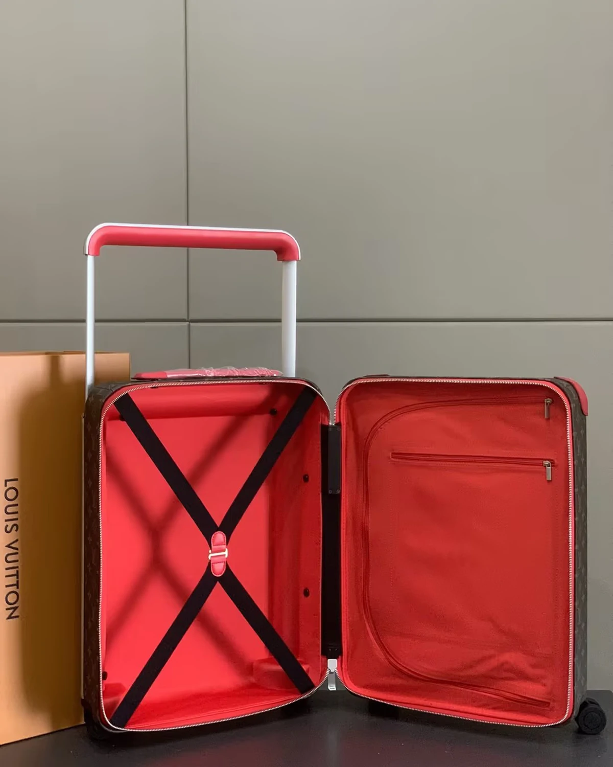 The Horizon 55 comes in Monogram canvas with top handle and leather corners in Coquelicot Red for Fall 2019. Imagined by Marc Newson, widely acknowledged to be one of the great industrial designers of his generation, this lightweight 4-wheeled carry-on has a completely flat interior thanks to its external cane. The Horizon 55 boasts a surprisingly large interior for a cabin-friendly bag.