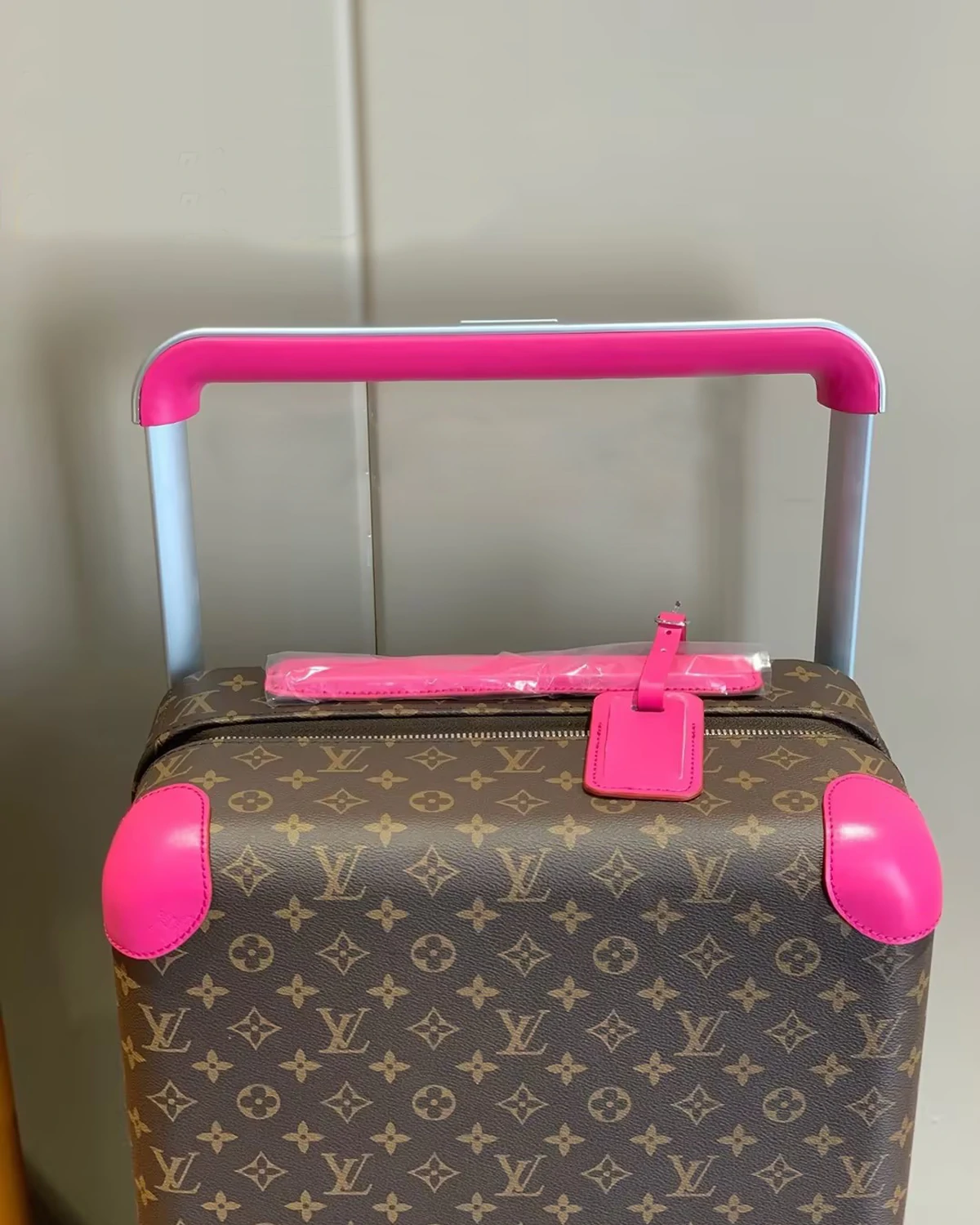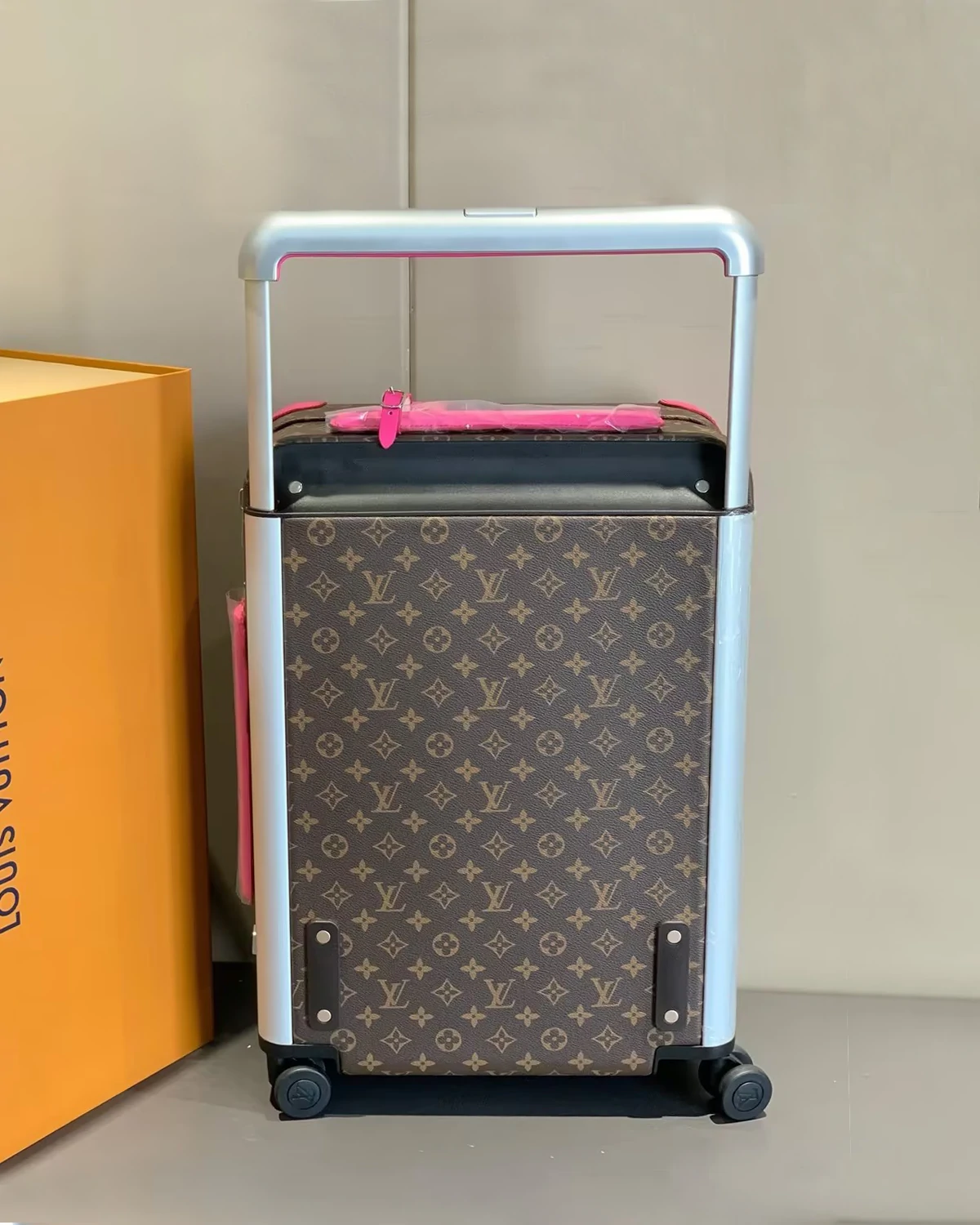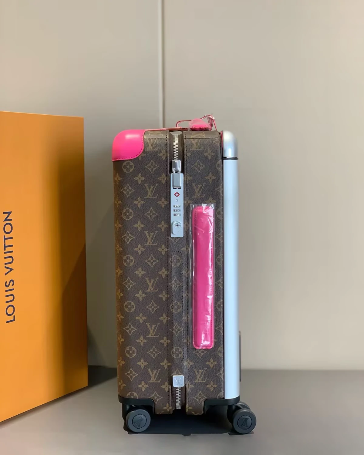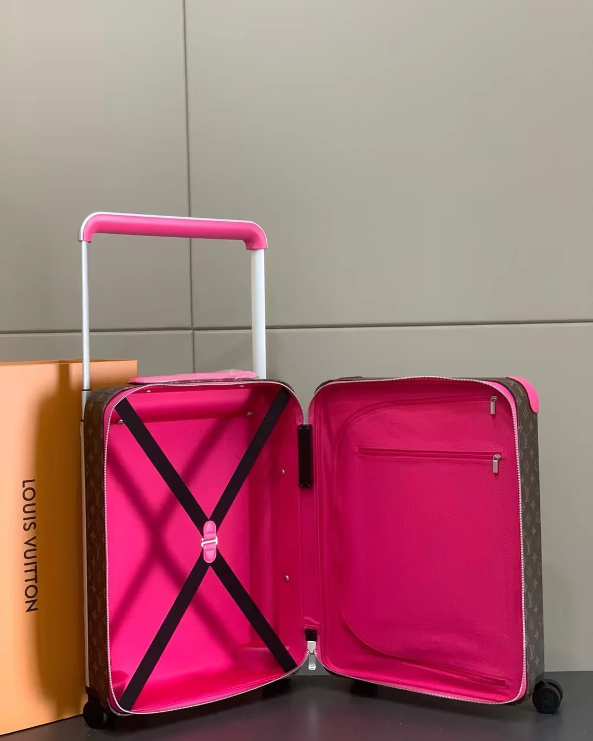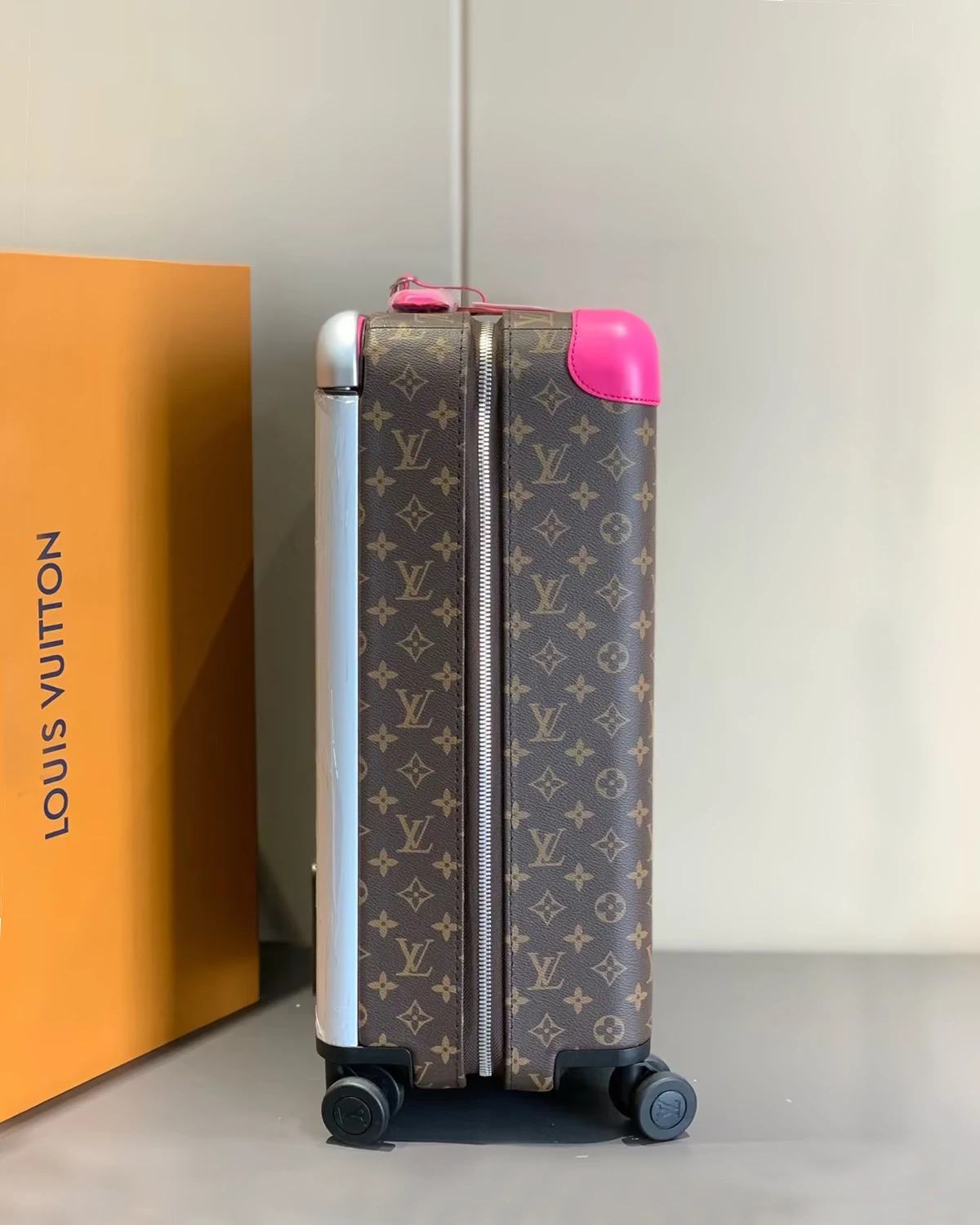This Horizon 55 rolling suitcase in Monogram Macassar canvas, with touches of vibrant color on the reinforced corners, cane handle, and its compact wheels, is small enough to carry onto a plane. And yet its interior is remarkably roomy thanks to its external cane. The lining is in the same bright color as the exterior details.
