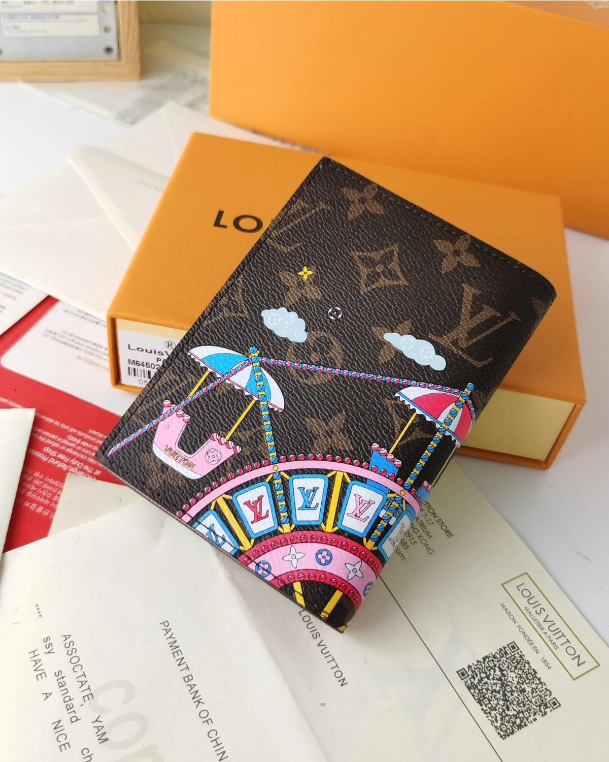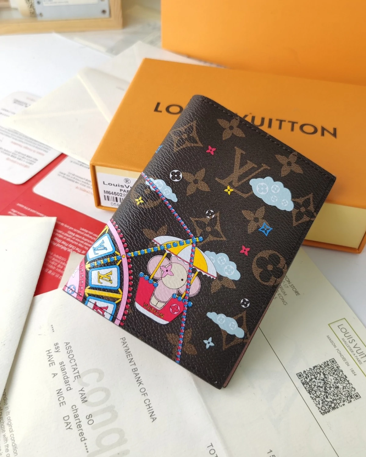 This is a Monogram 2020 Christmas Animation Big Wheel Passport Cover in Rose Ballerine. This passport case is crafted of classic Louis Vuitton monogram on coated canvas with a delightful print of the Vivienne mascot in riding a ferris wheel. The cover opens to a pink cross-grain leather interior with card slots, patch pockets, and a pocket for your passport.