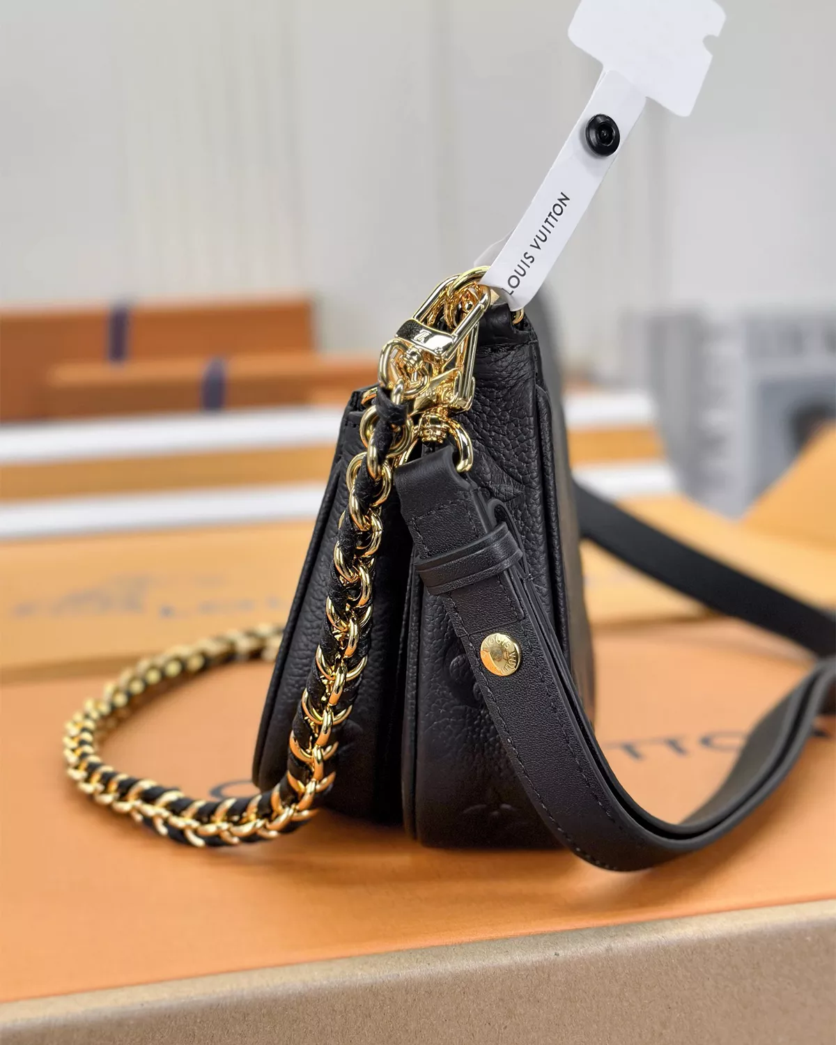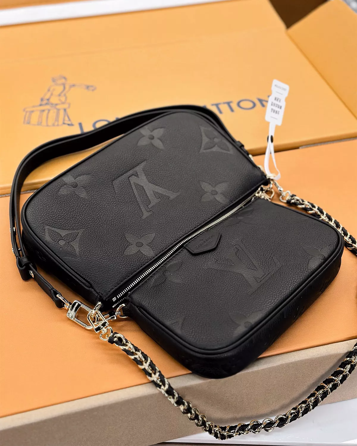 The riuce Multi Pochette Accessoires “Black Monogram Empreinte” redefines versatility with a two-in-one crossbody design. Crafted from supple embossed cowhide leather, it features a removable Large Pochette and Small Pochette, giving you multiple styling options for day to night. Accented with gold-tone hardware, a removable chain, and an adjustable leather strap, this bag combines elegance with functionality. Spacious enough to hold your smartphone, card holder, keys, and lipstick, it’s the perfect companion for modern lifestyles that require both style and practicality.