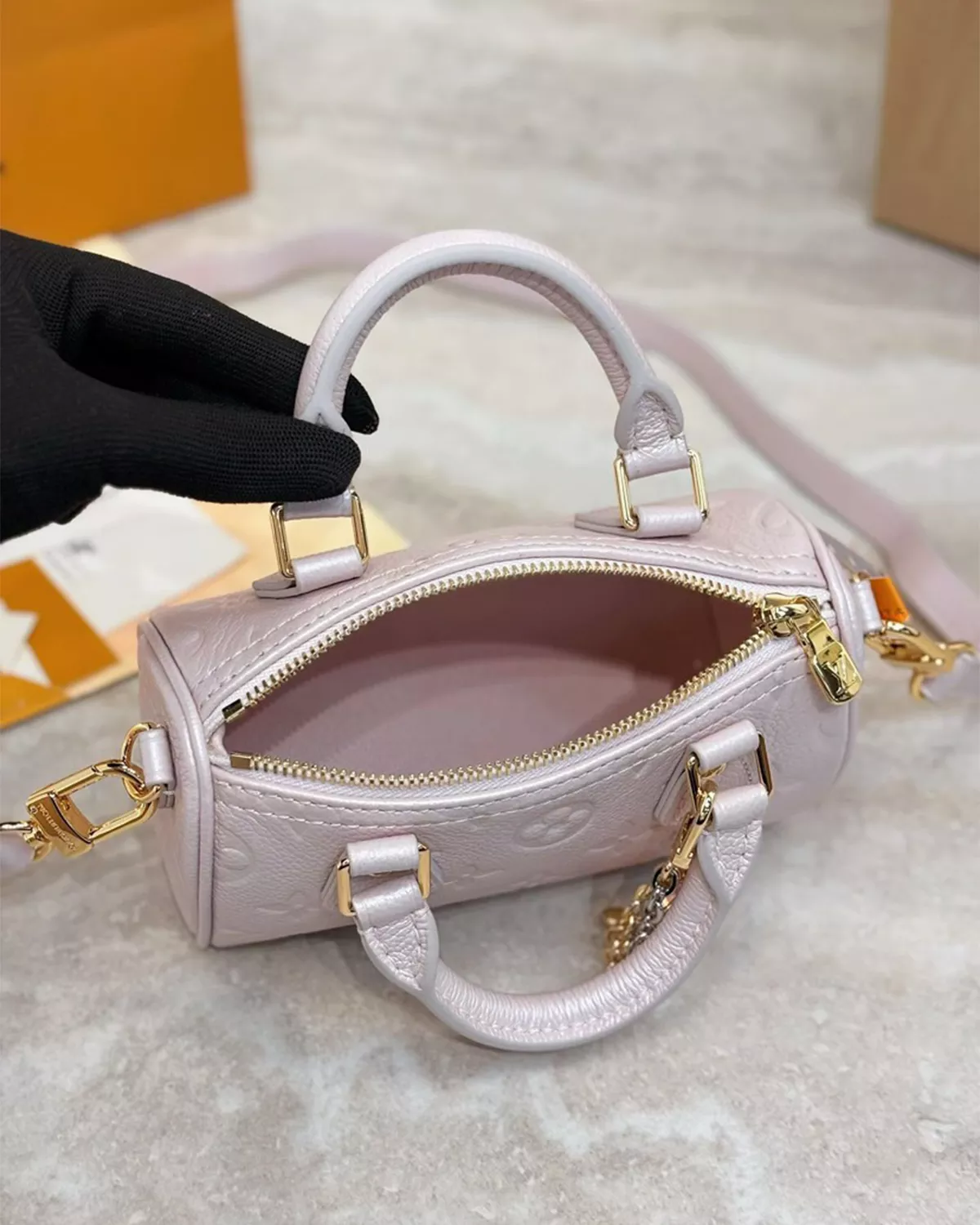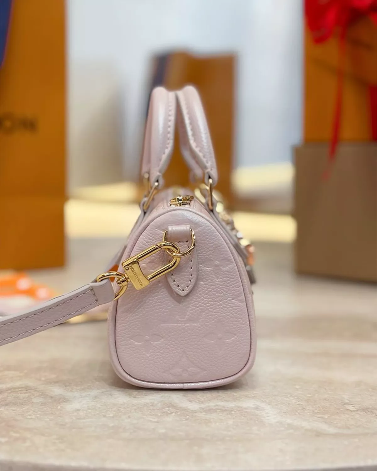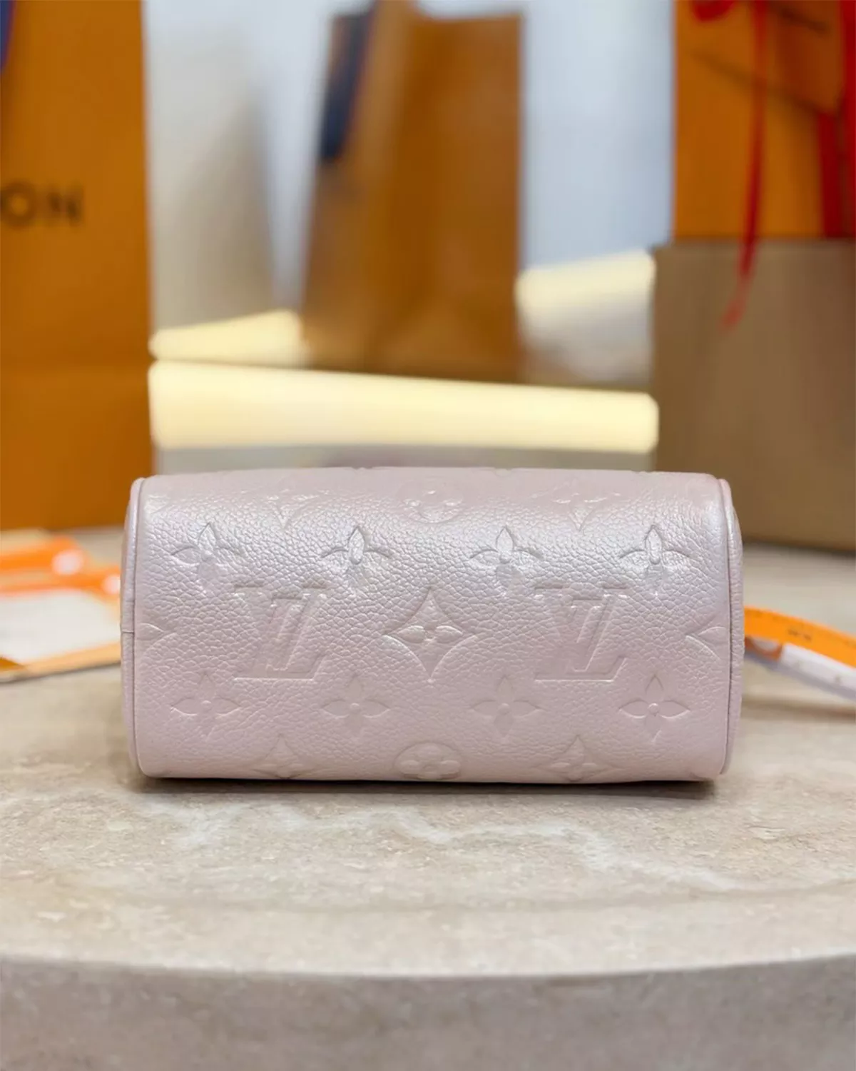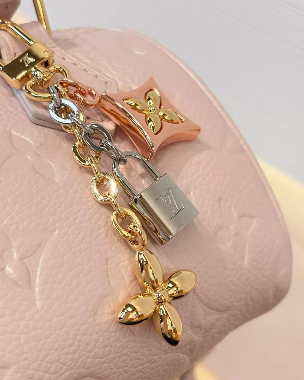 The Nano Speedy “Snowy Pearl” edition brings a fresh and luminous twist to a beloved miniature silhouette. Crafted from shimmery embossed leather in a refined Snowy Pearl tone, this compact bag enhances any look with soft iridescent elegance. Silver-tone hardware and a multi-metal removable charm—featuring padlock and floral motifs—add a playful, polished touch.