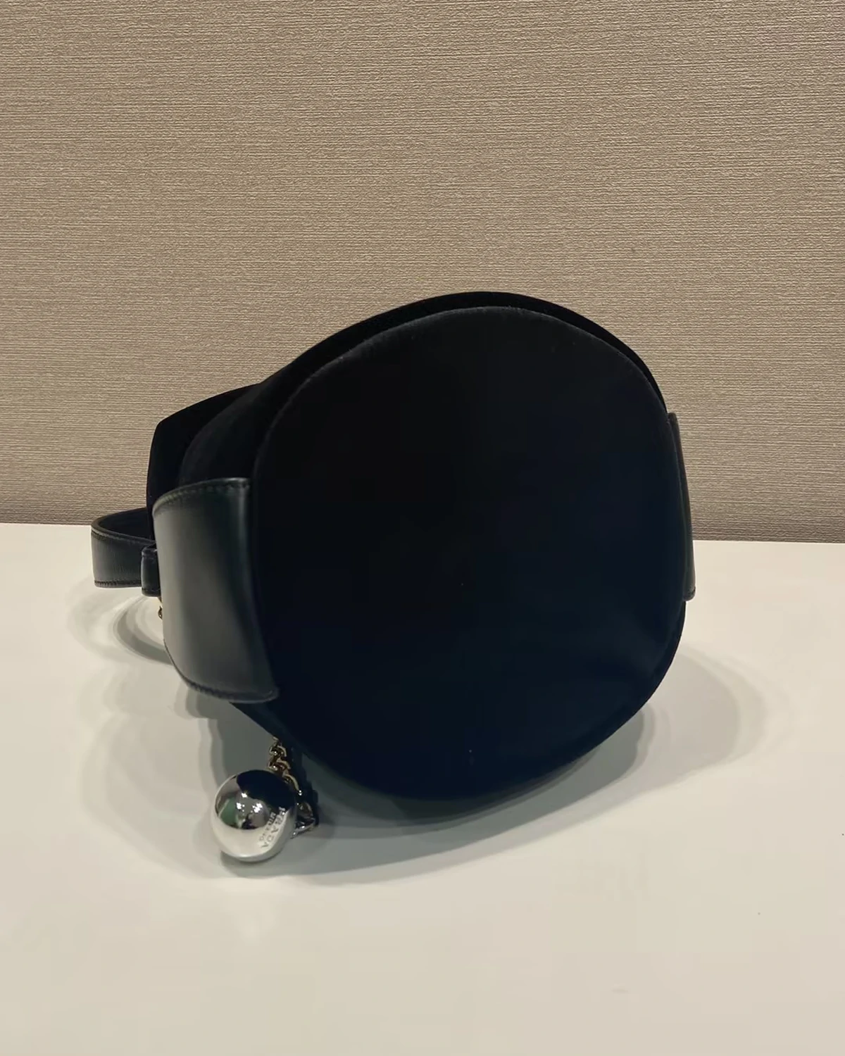 A sophisticated and contemporary identity characterizes this bucket bag with a soft silhouette crafted in velvet and nappa leather. The sleek simplicity of the design is paired with macro details like the chain with spherical pendant that gives it a refined and distinctive character.