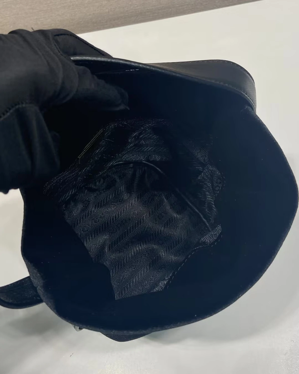 • Handle: Nappa leather handle, drop 10 cm • Hardware: Metal hardware • Logo Details: Enameled metal triangle logo on the back • Closure: Snug chain closure • Interior: Logo-print Re-Nylon lining