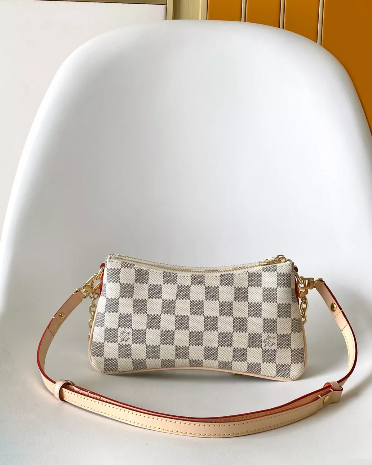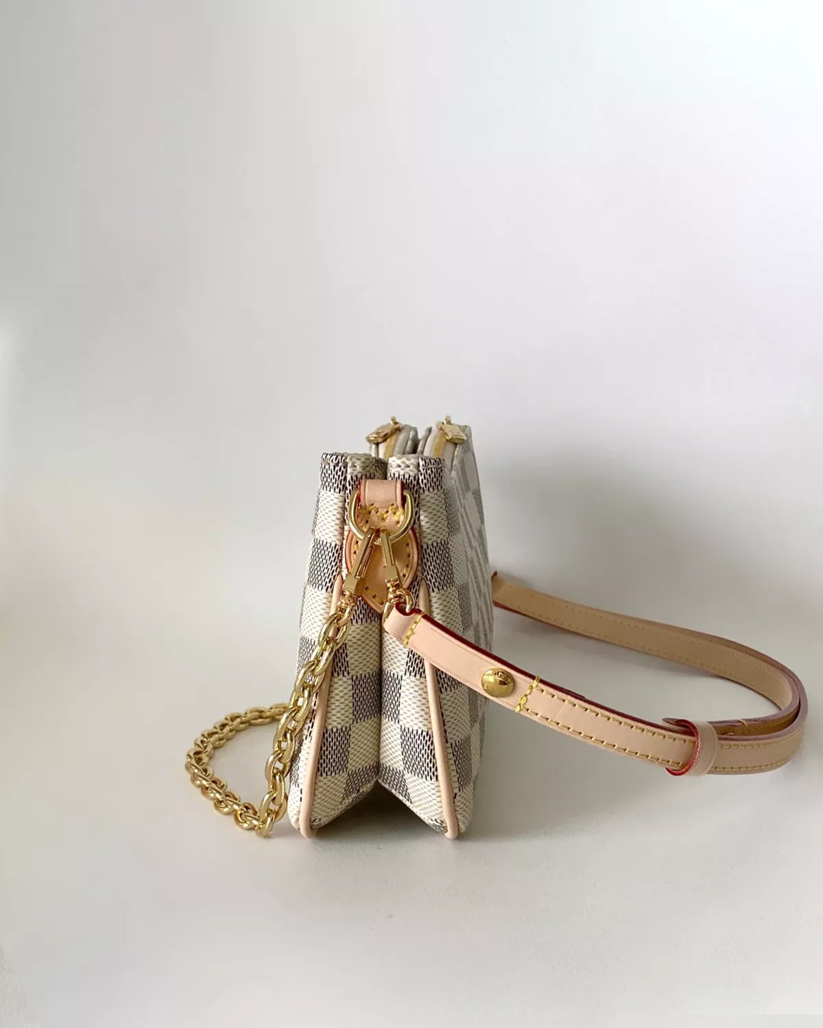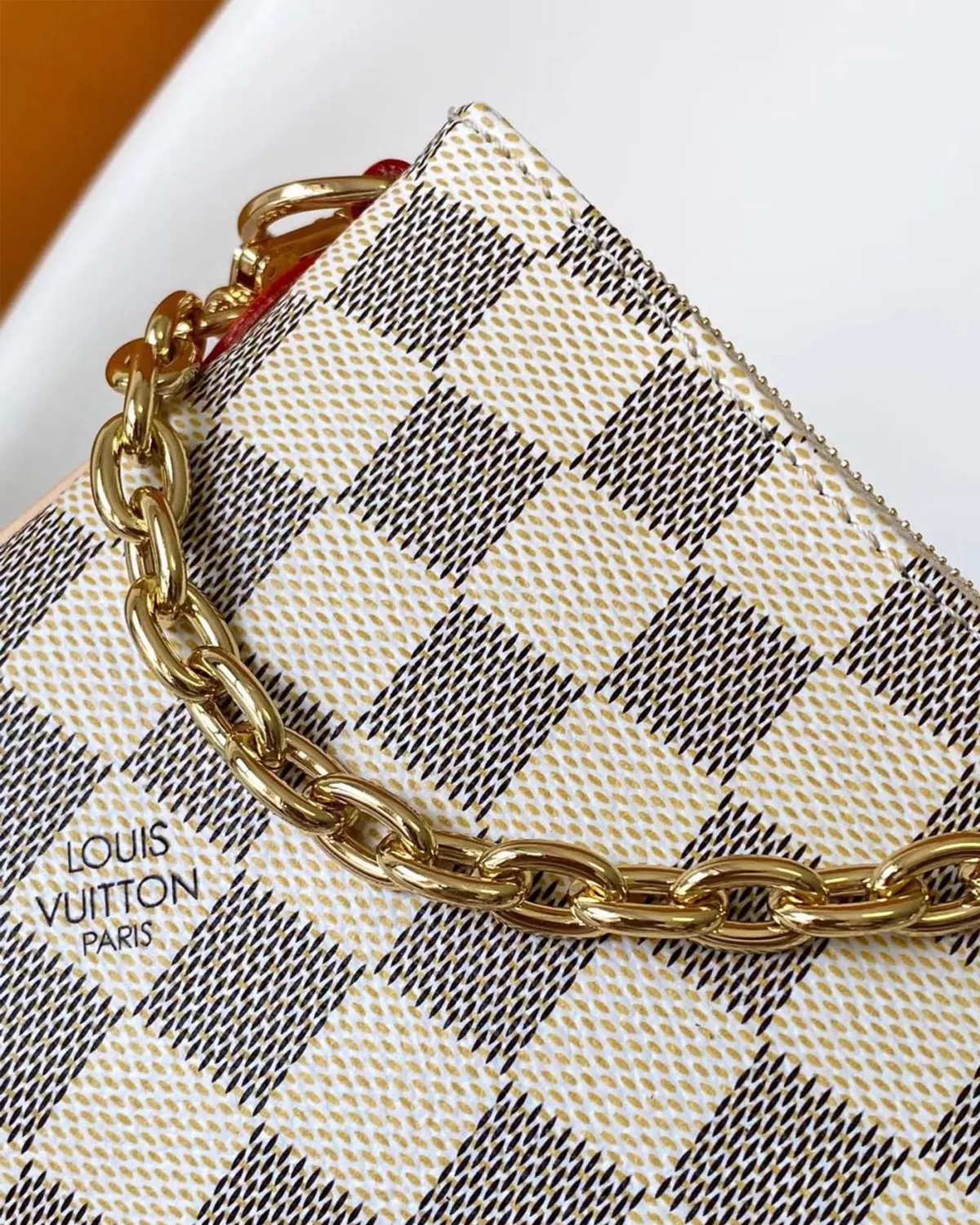 The rebce Pochette Liv Bag in Damier Azur is a limited-edition release available exclusively in the Americas. Crafted from the iconic Damier Azur coated canvas with cowhide leather trim, this elegant pochette transitions seamlessly through all seasons. Its compact silhouette is complemented by a removable gold-tone chain and adjustable strap, allowing it to be styled as a shoulder bag, crossbody, or chic clutch. The double-zip closure opens to a microfiber-lined interior with a central pocket, making it perfect for carrying essentials like your phone, keys, and wallet. Finished with a signature craftsmanship plaque, the Pochette Liv is the ideal blend of versatility and timeless elegance.