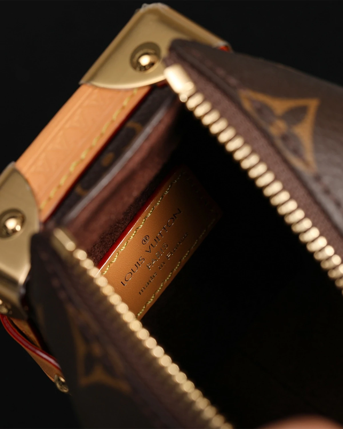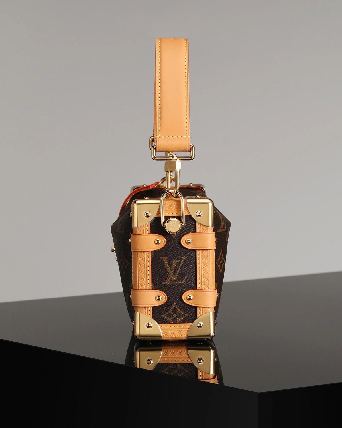 Evocative of the House’s historic trunks, the Side Trunk PM’s rectangular shape is fashioned from Monogram canvas with cowhide-leather trim and gold-color hardware. The reinforced corners and S-lock attached to the zipper are directly inspired by Louis Vuitton trunks. It can be carried by hand or on the shoulder thanks to the removable and adjustable leather strap.