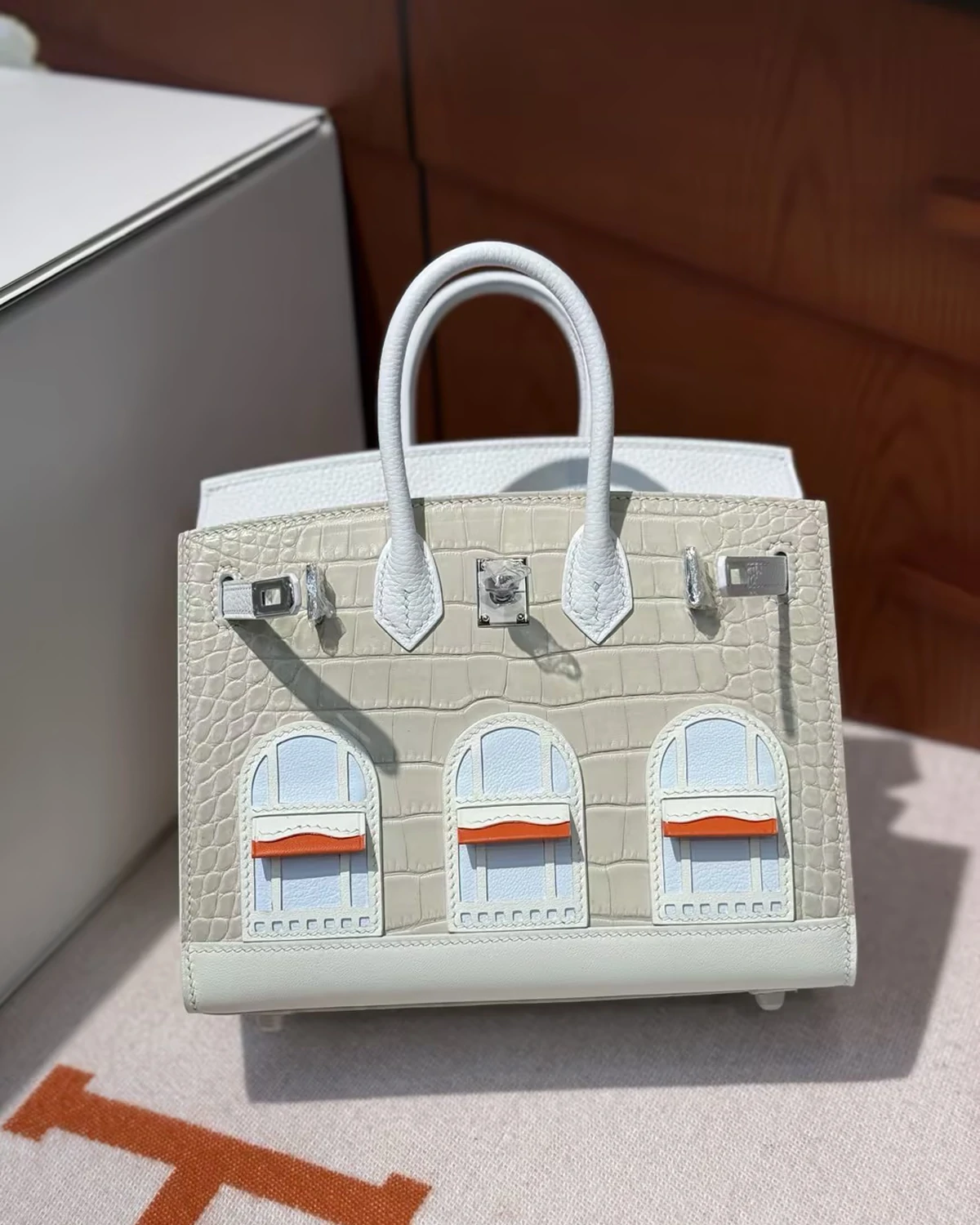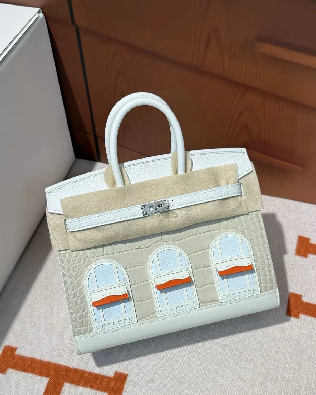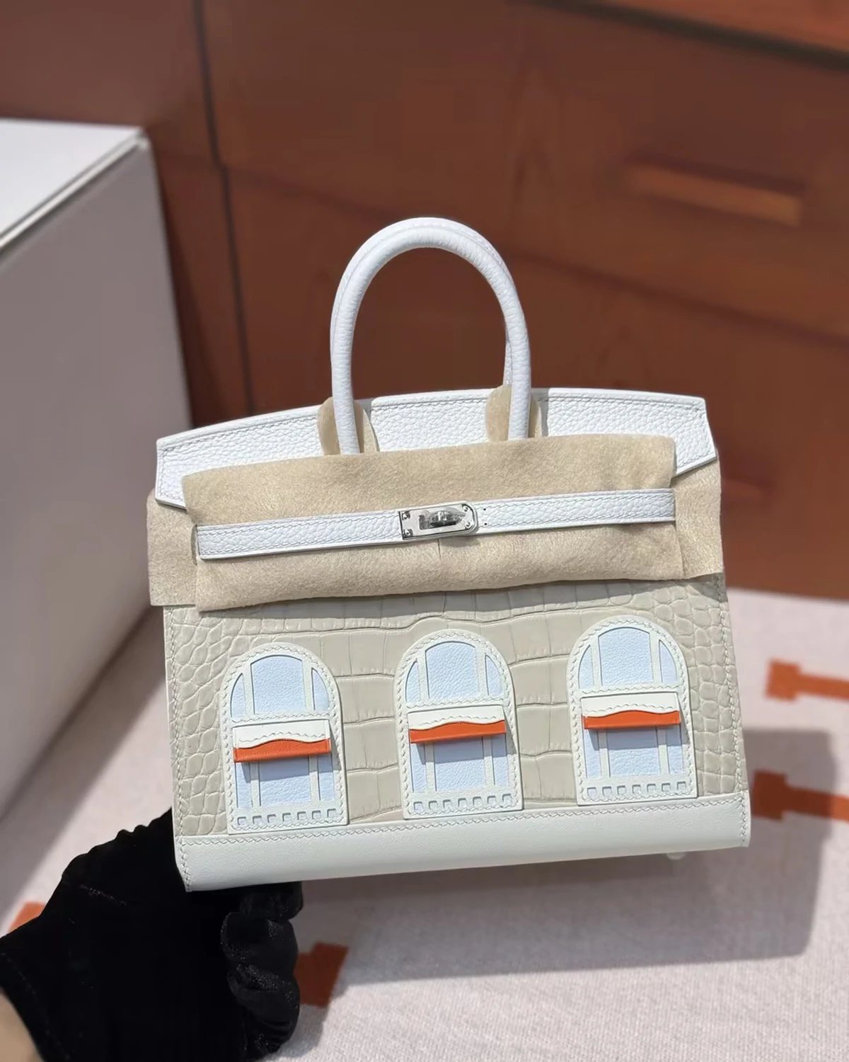 This "Snow" series Sac Faubourg Birkin Sellier 20 is an extremely rare limited edition, crafted exclusively for the most distinguished VIP clients. Inspired by a snowy winter night at 24 Rue Saint-Honoré in Paris, the bag is renowned for its cool, architectural tones and exquisite material contrasts. The front is crafted from matte Beton crocodile leather, paired with a white Togo leather flap and accented with blue Brume Chèvre lambskin window details, evoking the serene elegance of a snow-covered Parisian street scene. The base is finished in Sombrero leather, providing the design with a sturdy structure and durability. The skillful blending of textures and tones showcases exceptional craftsmanship and artistic precision.