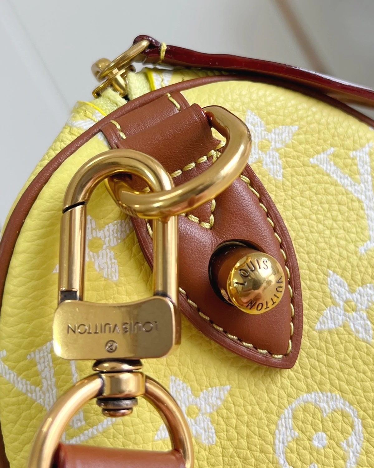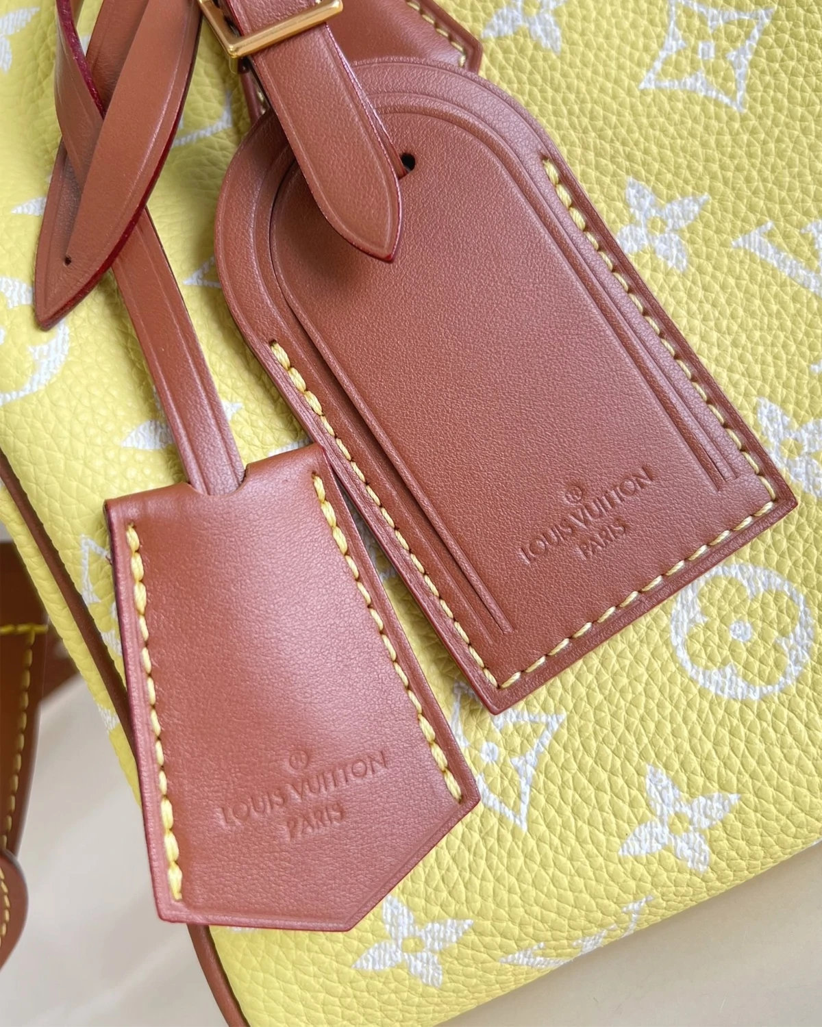 The Speedy P9 Bandoulière 25 is crafted from calfskin in a yellow hue that fades in the sun. Perfect for everyday use, the Speedy P9 features a removable leather pouch lined with luxurious lambskin, two top handles, and a removable, adjustable shoulder strap for versatile carrying options.