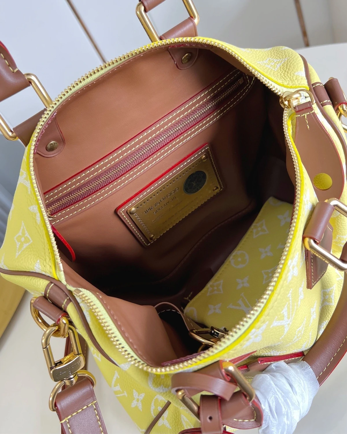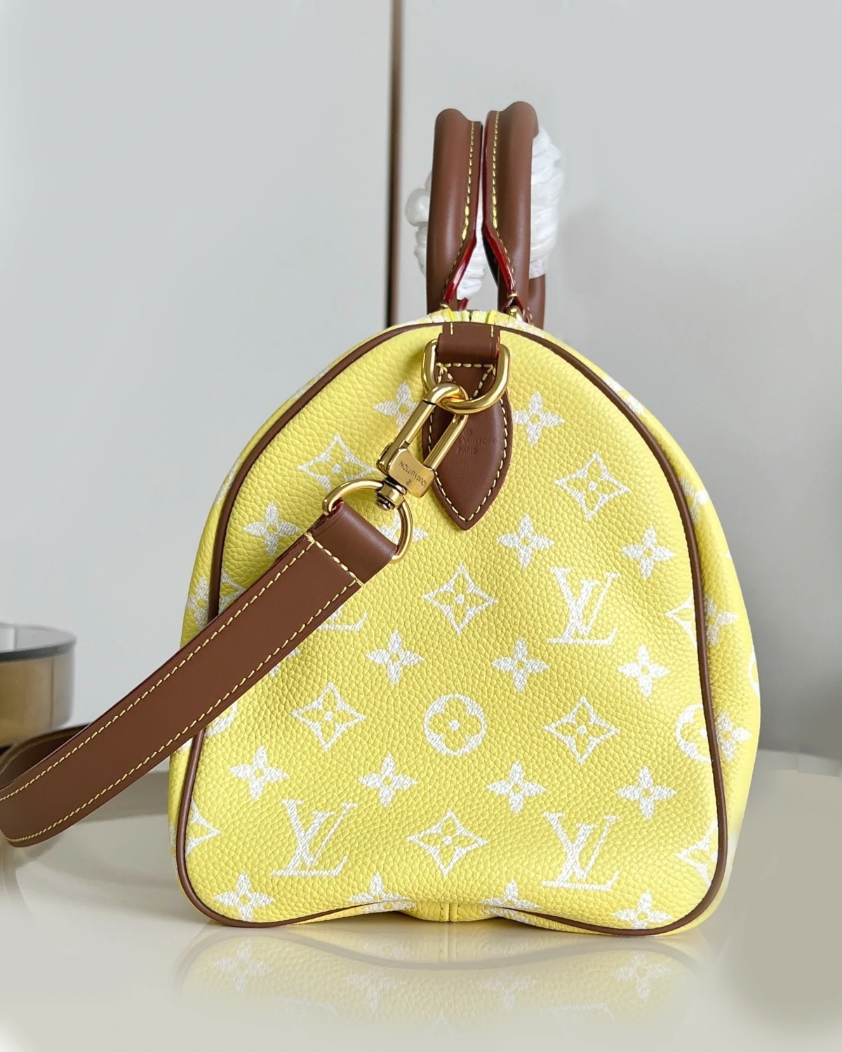 The Speedy P9 Bandoulière 30 is crafted from super-supple calfskin with a lambskin lining. Meticulous attention is given to the leather's thickness to achieve an exceptionally soft hand, featuring thin edges while maintaining the bag's sturdiness. The calfskin trim is tinted to a darker shade than usual, giving the natural leather a vintage look.