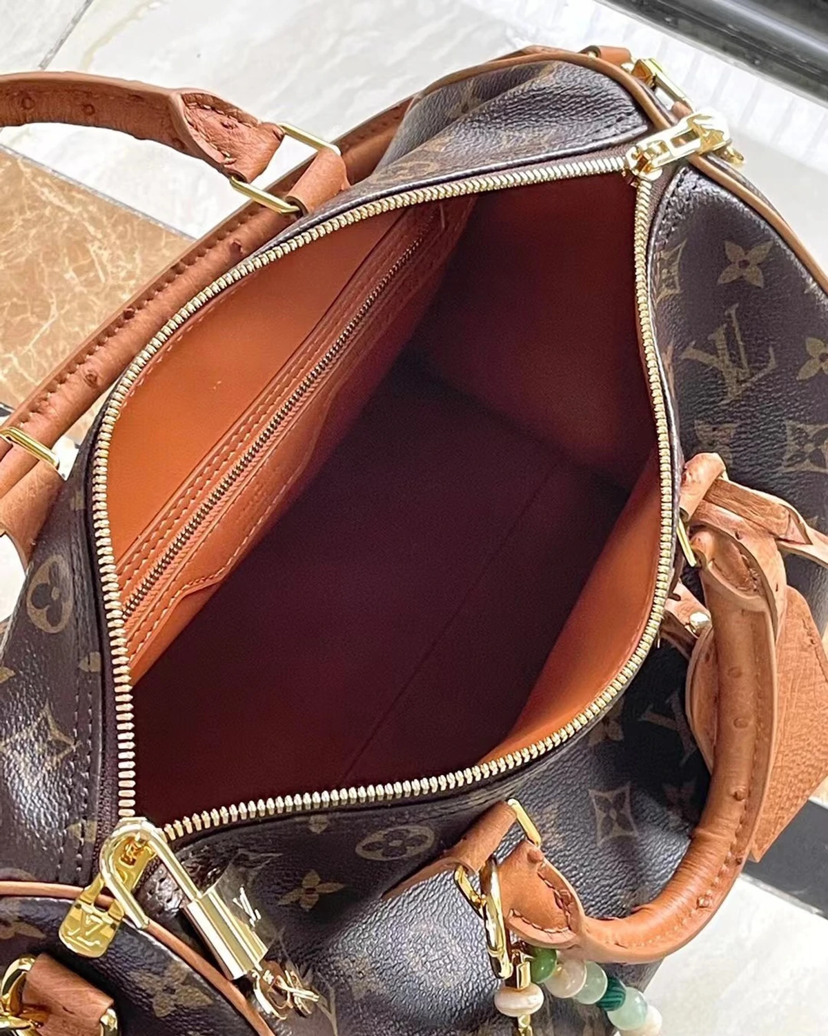 The Speedy Soft 30 Boho bag is crafted from classic Monogram coated canvas, adding a touch of contrast with its leather lining and zippered interior pocket. Ostrich leather trim and a beaded chain create a focal point, while a key holder and address plaque add clever details. The Toron handle allows for versatile carrying options.