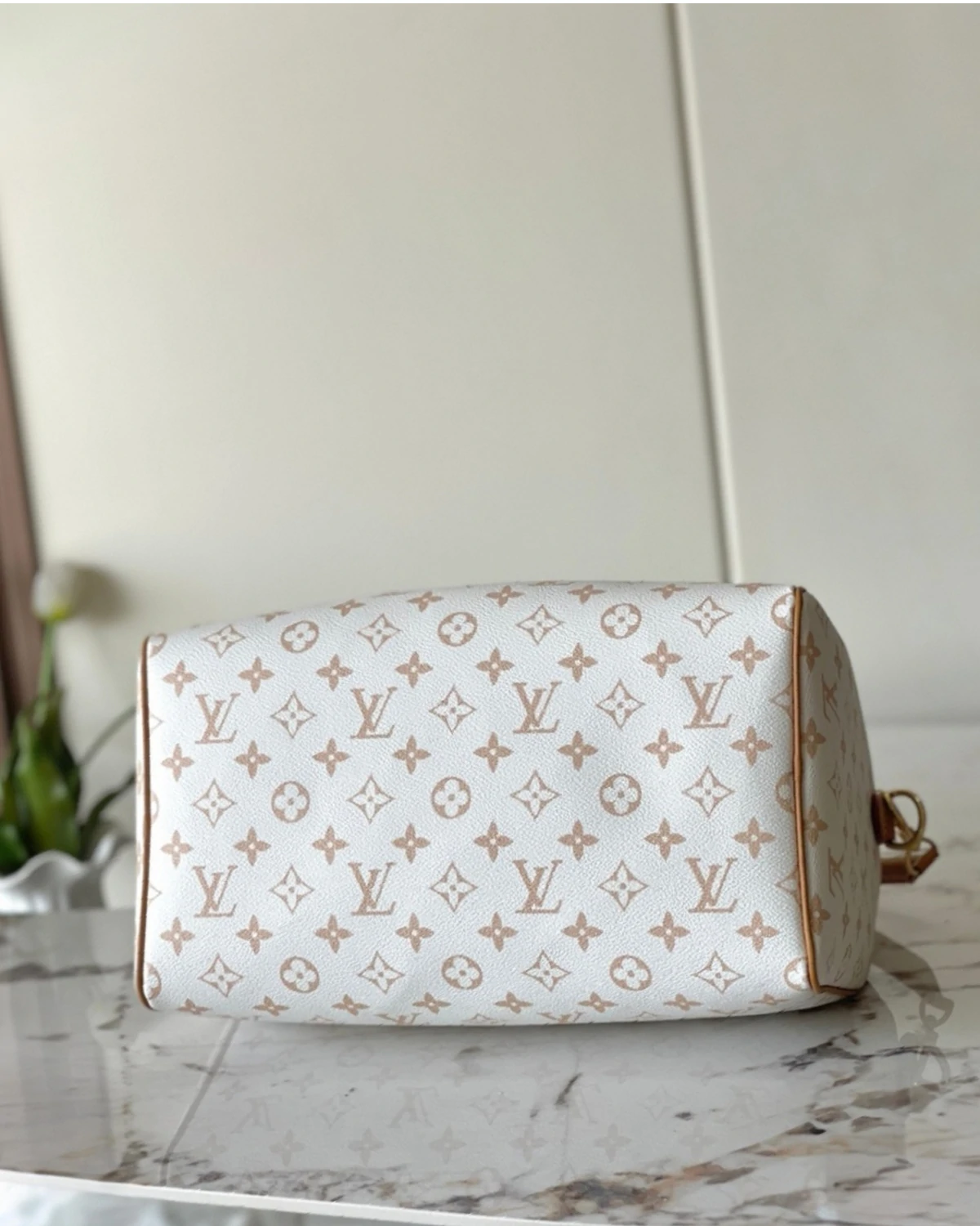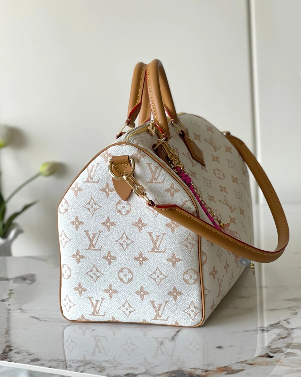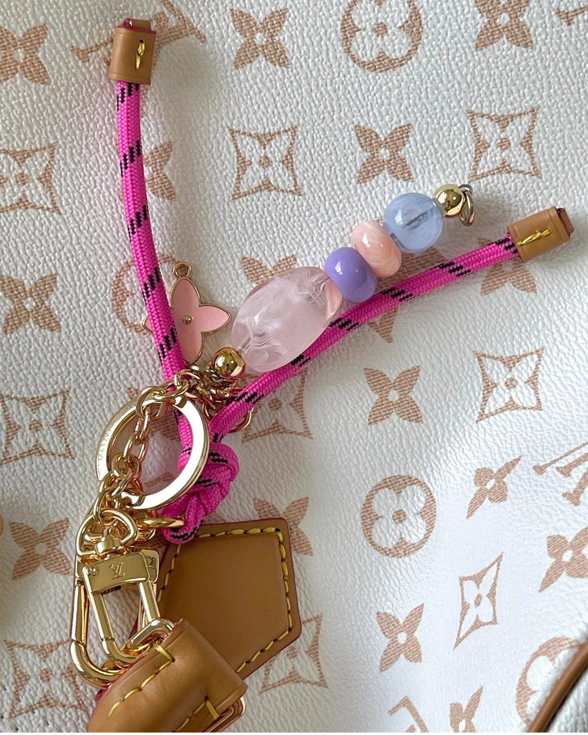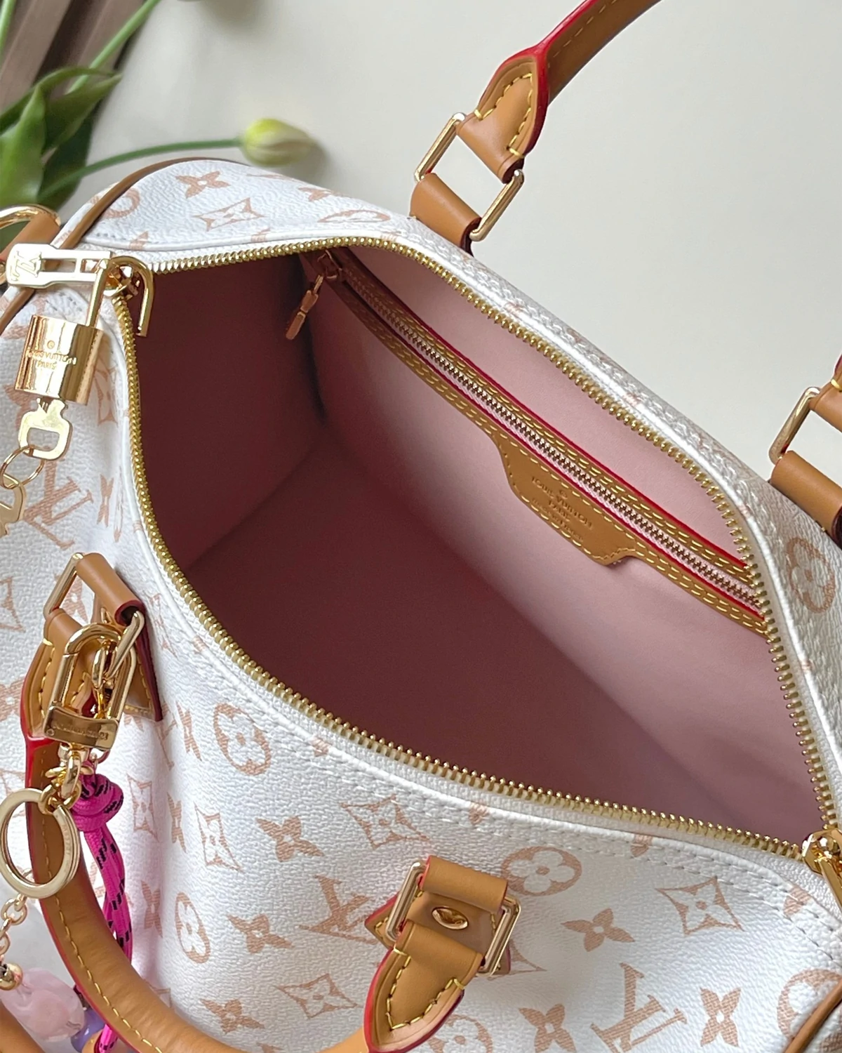 The iconic Speedy Soft 30 Lucky is reinvented with jewel-like embellishments and a contrasting pastel-pink lining to enhance its attention to detail. It is crafted from Monogram Dune canvas with VVN leather trims and is adorned with gold-toned hardware, plus a unique talisman charm and colorful rope knot. Capaciously sized, the versatile design is roomy enough to store a tablet as well as other daily essentials.