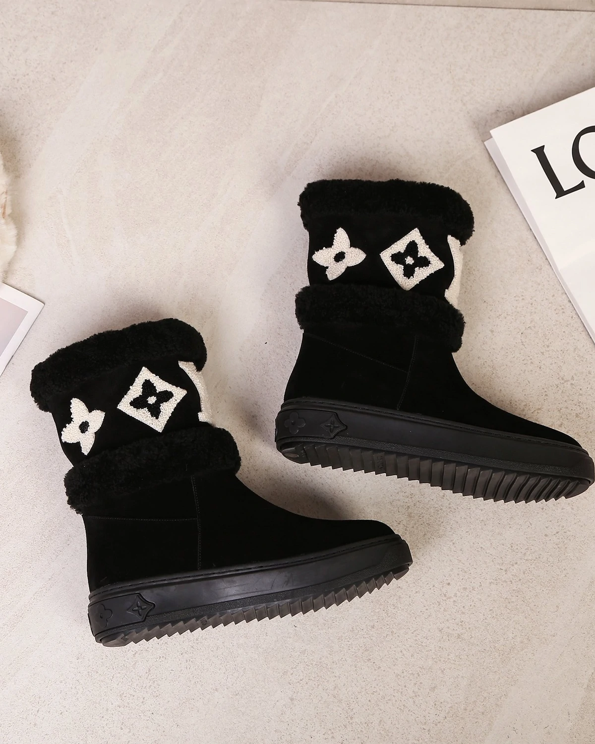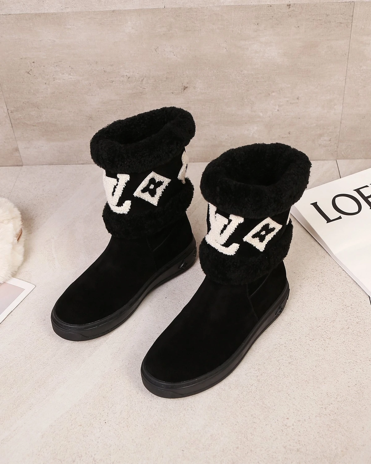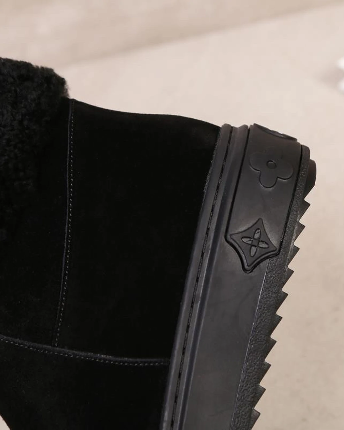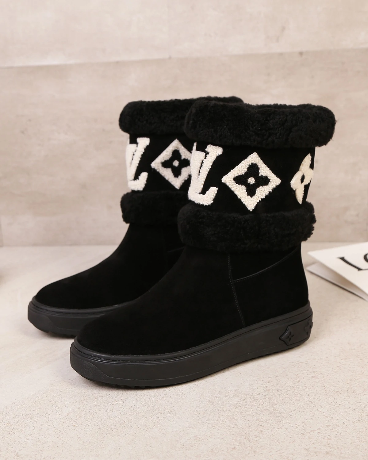 This is a pair of Suede Calfskin Shearling Snowdrop Flat Ankle Boot in Black. These desert boots are crafted of black suede, with a Monogram shearling fur accent.