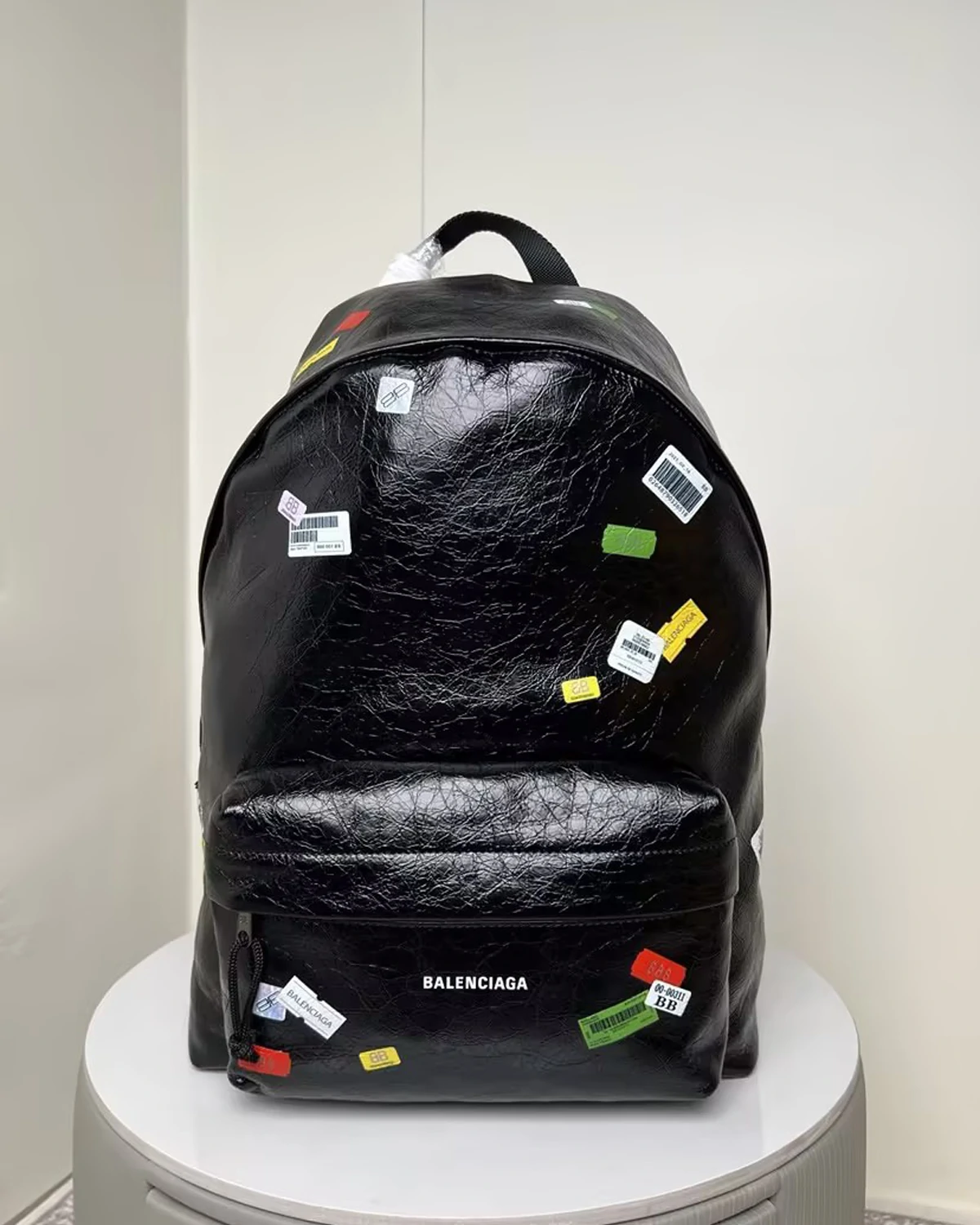 Black leather explorer backpack with printed stickers