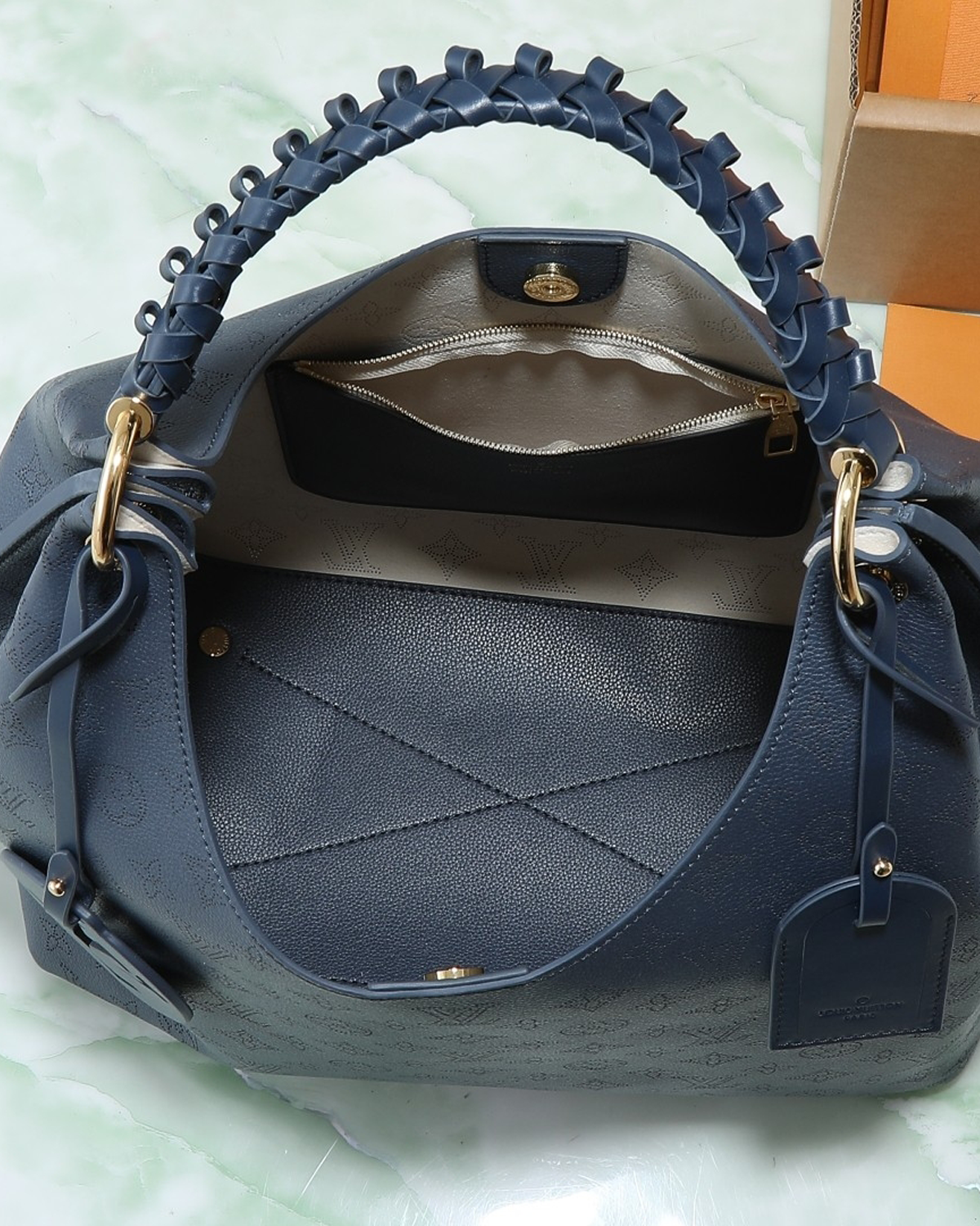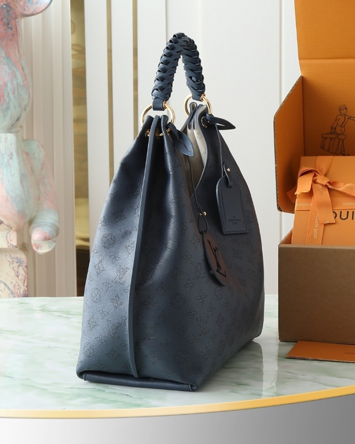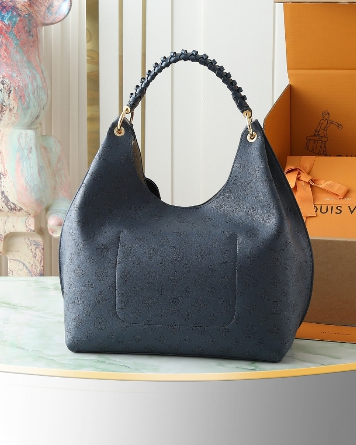 This elegant edition of the Carmel handbag is crafted from Mahina calfskin, delicately perforated with the House’s signature Monogram. Sized to store daily essentials, including a laptop, the versatile design is elevated with a removable leather braided charm. Note the address tag, which pays tribute to heritage Louis Vuitton trunks.