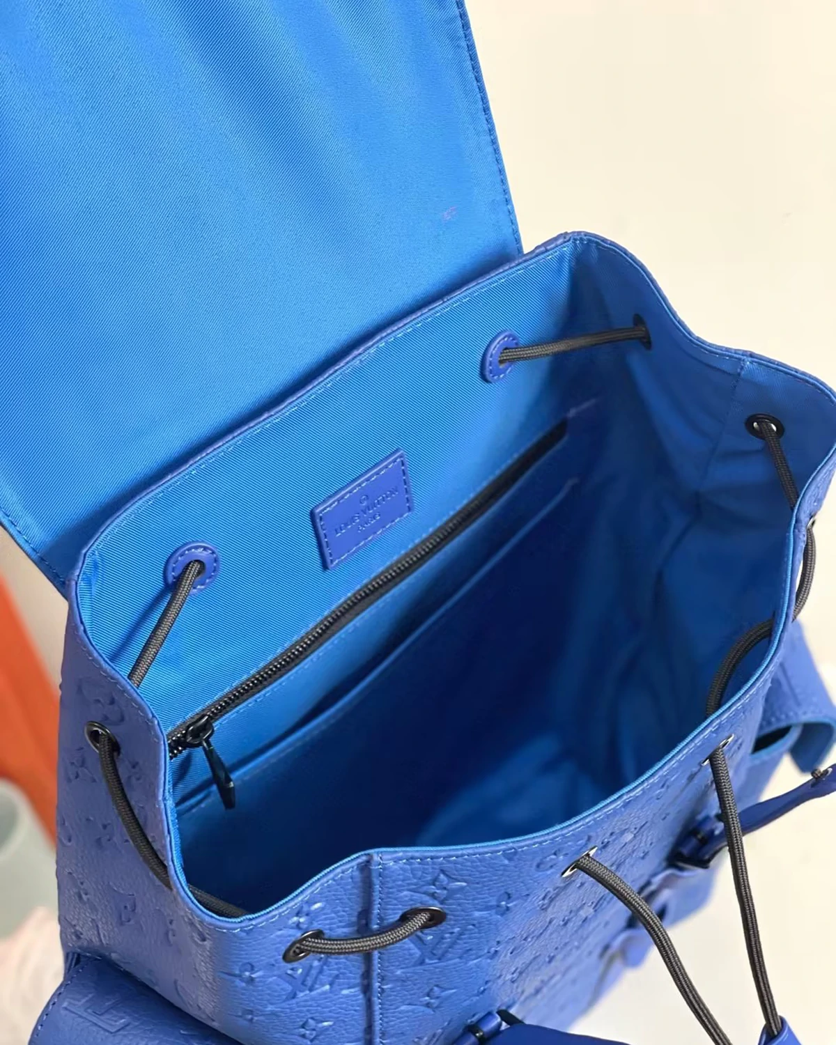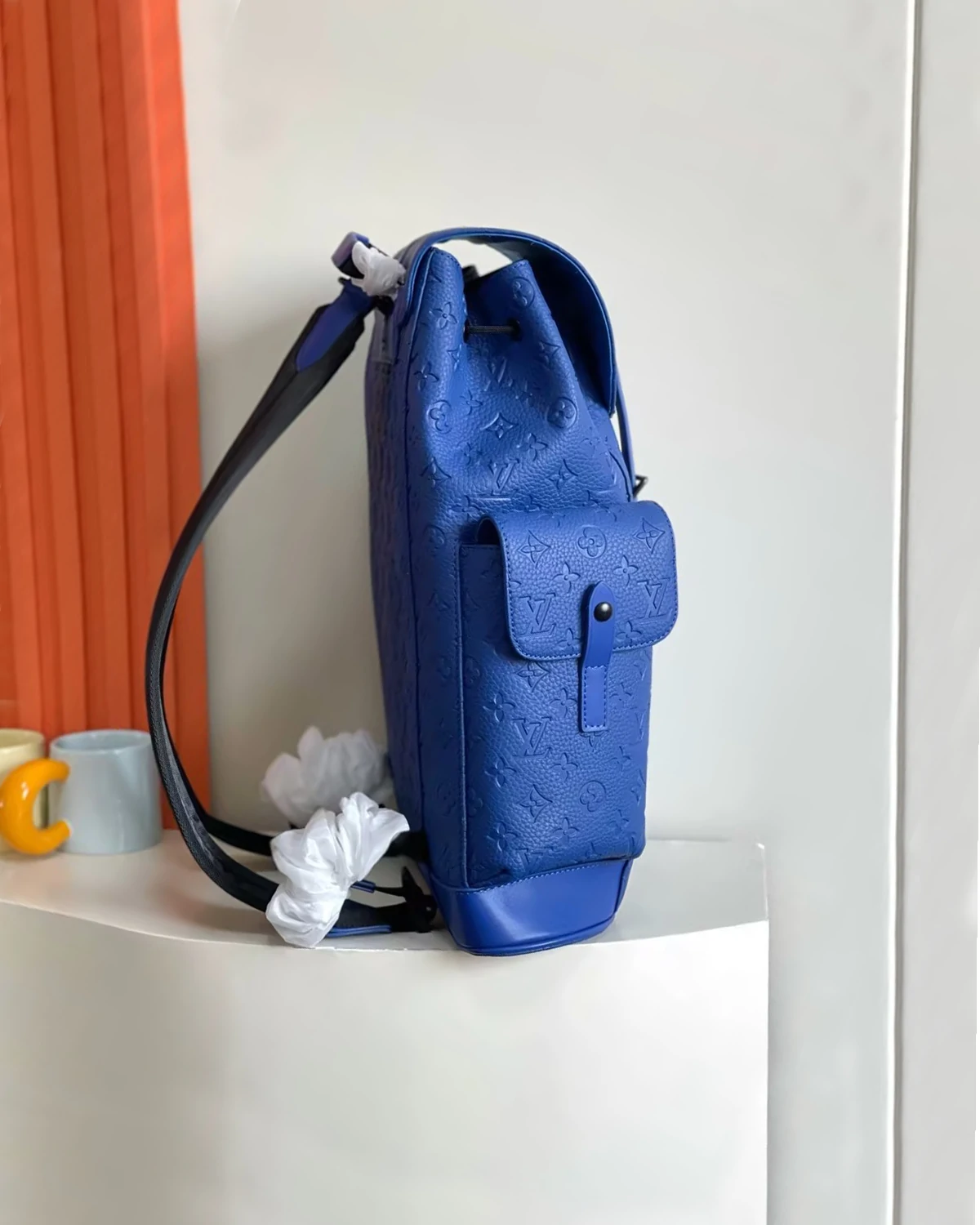 The Christopher MM backpack is a mid-sized backpack with two exterior side pockets and numerous functional pockets inside. Fashioned from Taurillon leather with an embossed Monogram motif, it is finished with black leather straps and matte-black hardware. A drawstring and press-stud closure keeps what’s inside secure.
