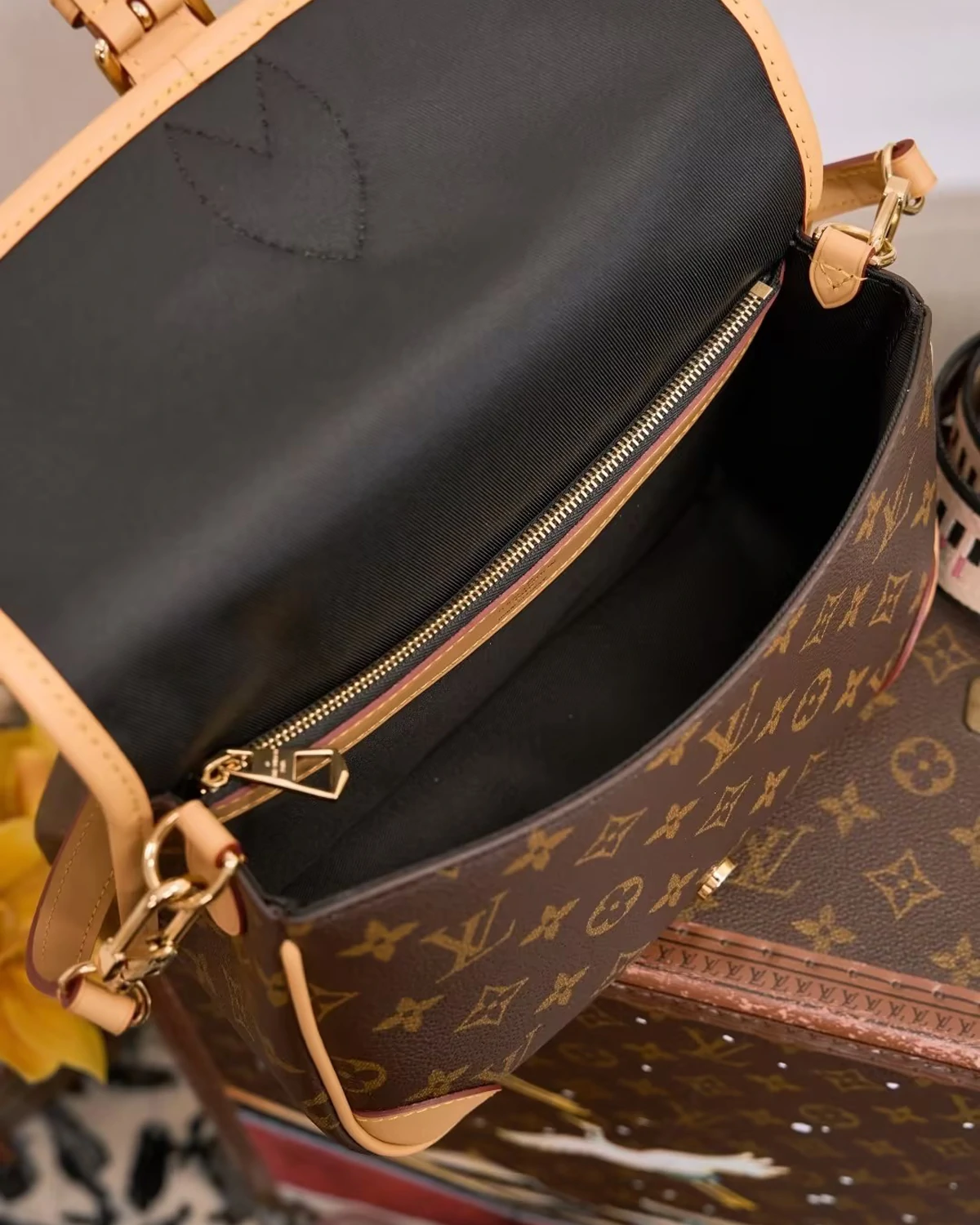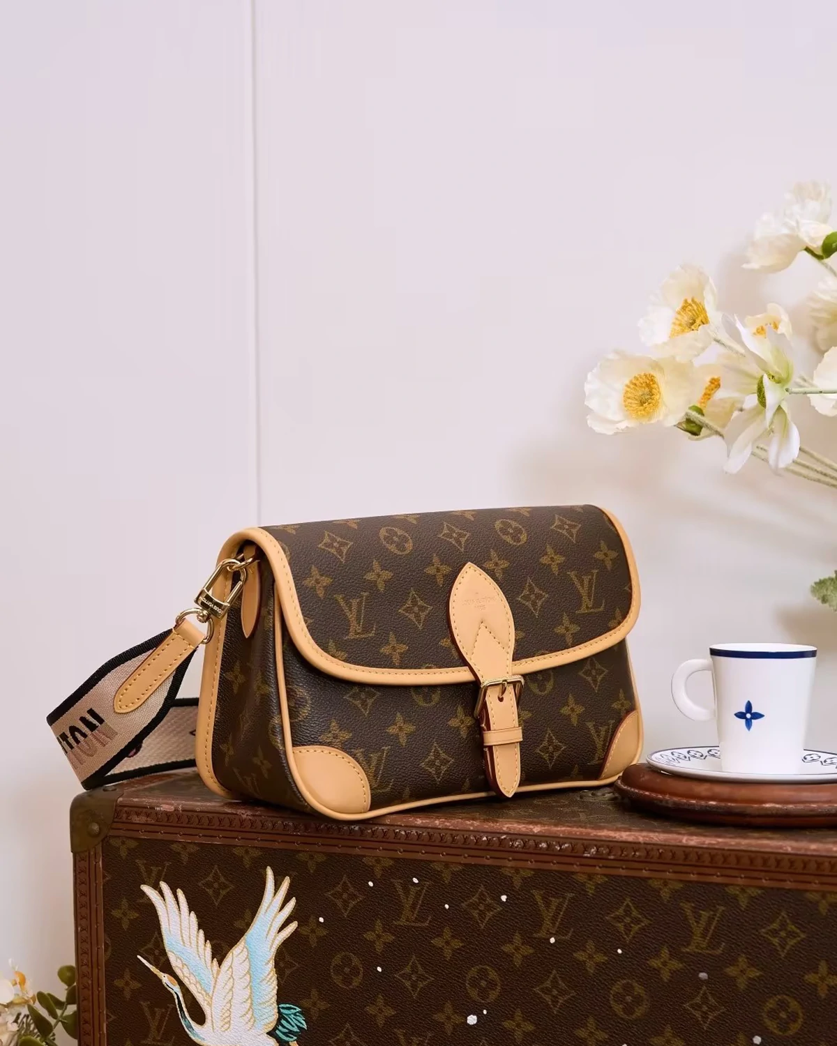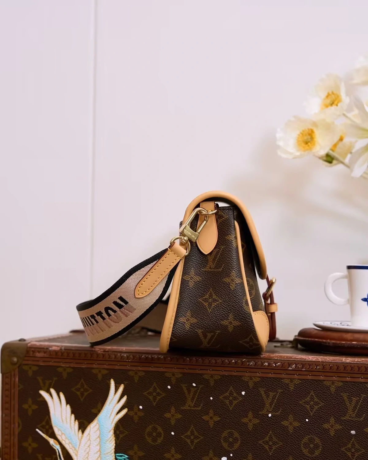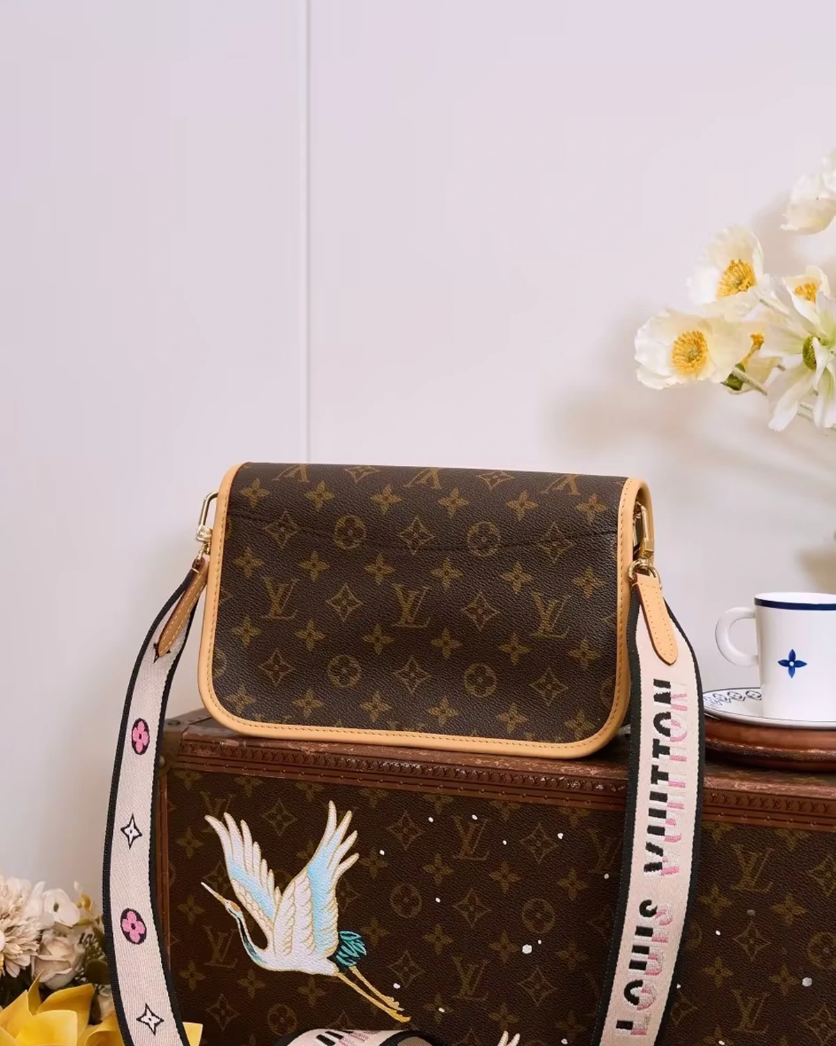 This Diane preppy long bag is crafted from Monogram canvas and reinterprets classic 90s style with vintage details such as leather corner protectors and vintage-style clasps, combined with modern practicality like stylish pockets and well-organized interior compartments. The unique jacquard wide shoulder strap features a prominent brand logo on one side and a subtle Monogram floral pattern on the other.