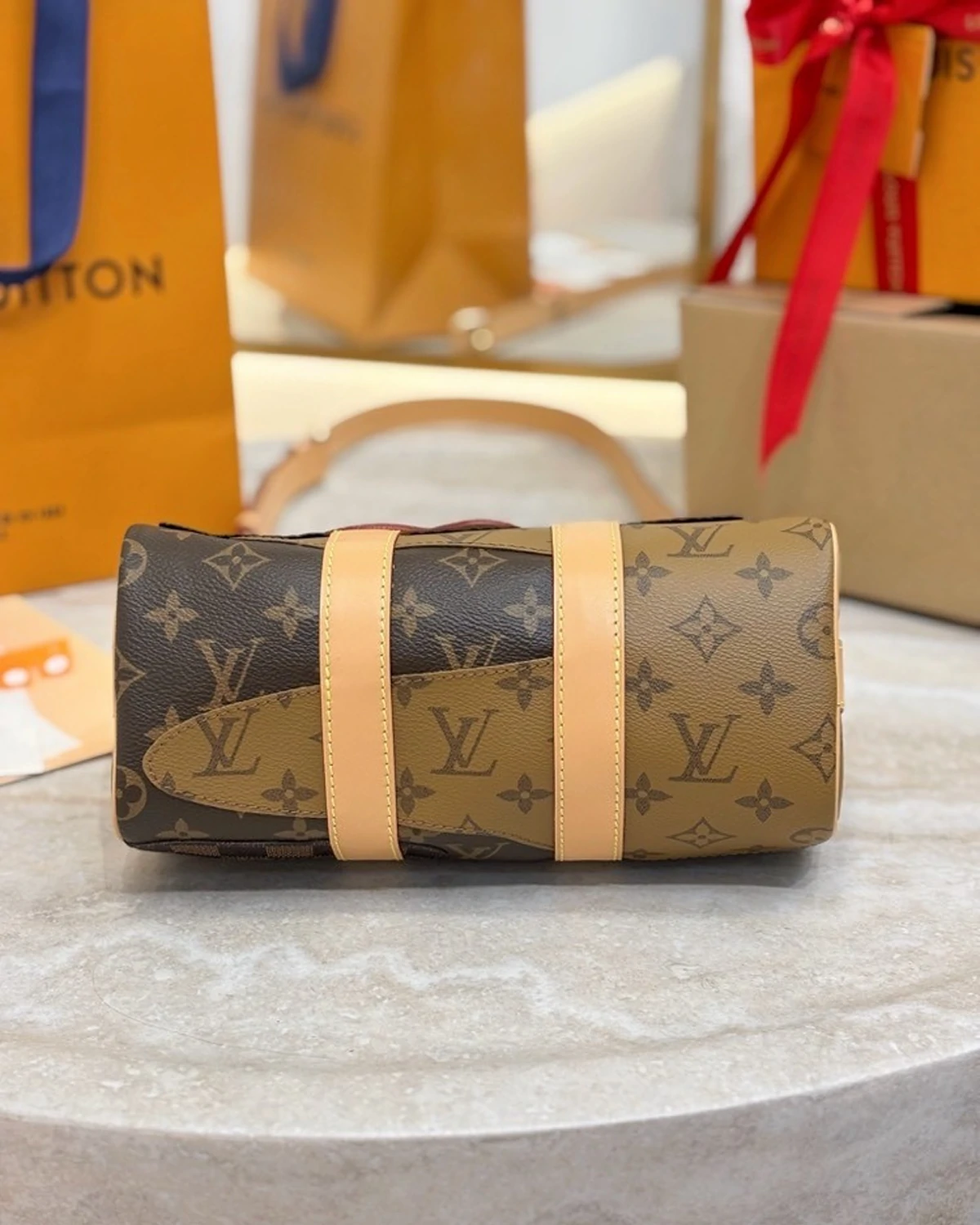 The Keepall Bandoulière 25 city bag is crafted from a combination of Monogram and Damier canvas, creating a motif evocative of an abstract landscape. Inspired by the Japanese boro technique of repeatedly patching fabric, Damier and Monogram patches are embroidered on top of the House’s iconic brown Monogram canvas.