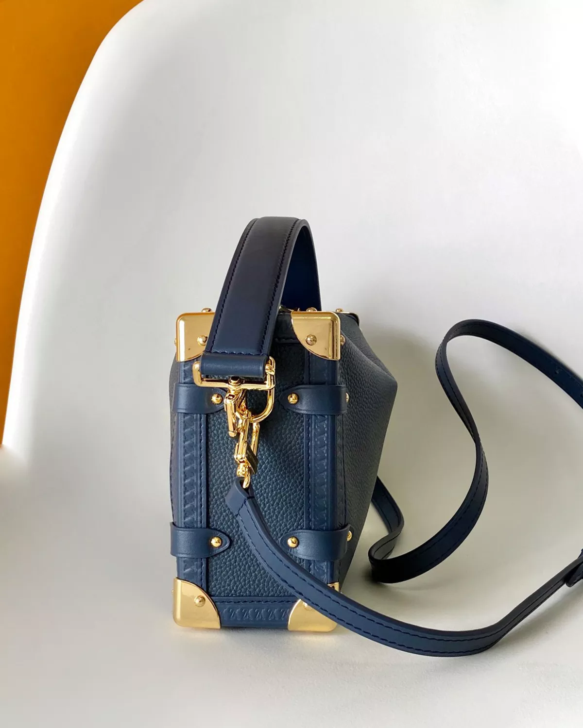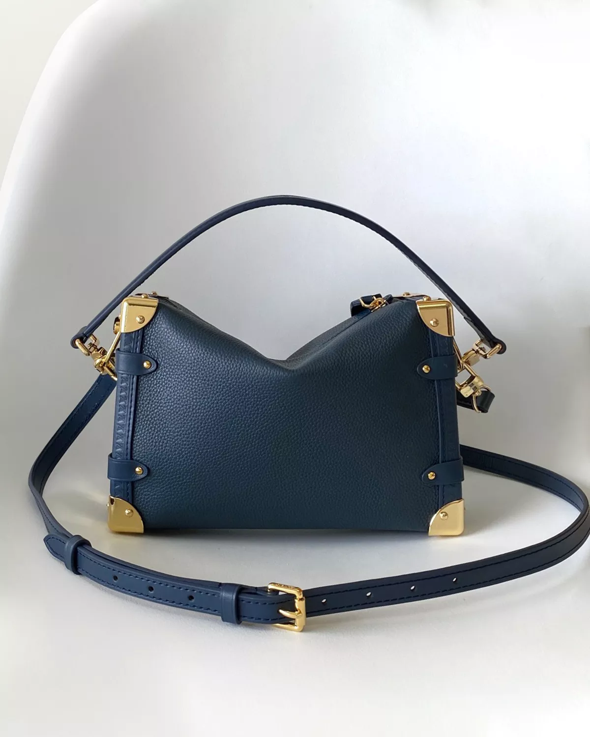 The rebce Side Trunk MM Bag in Navy blends everyday elegance with vintage-inspired design. Taking cues from classic travel trunks, this structured handbag is crafted from smooth calfskin leather with cowhide trim and finished with gold-tone hardware. Its standout detail is the signature S-lock closure, paired with a secure zip fastening. The microfiber-lined interior is sized to fit a 6.7-inch smartphone, long wallet, and daily essentials, making it both stylish and functional. With a removable, adjustable strap and a detachable top handle, the Side Trunk MM offers versatile carry options — perfect for both daytime sophistication and evening outings.