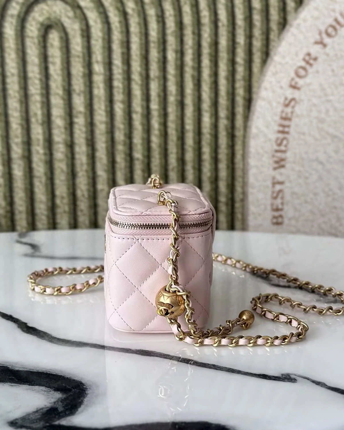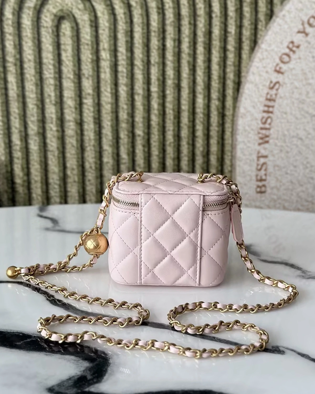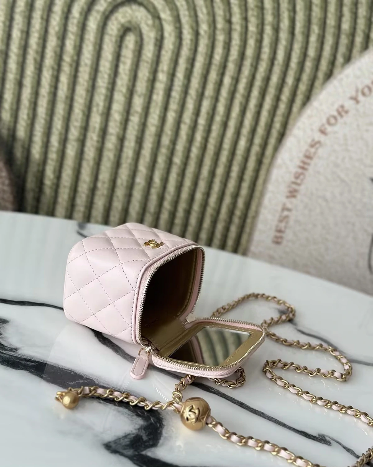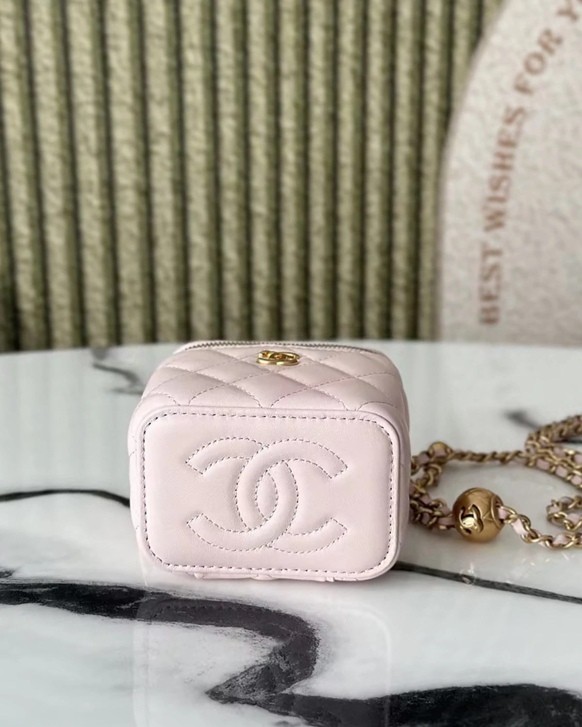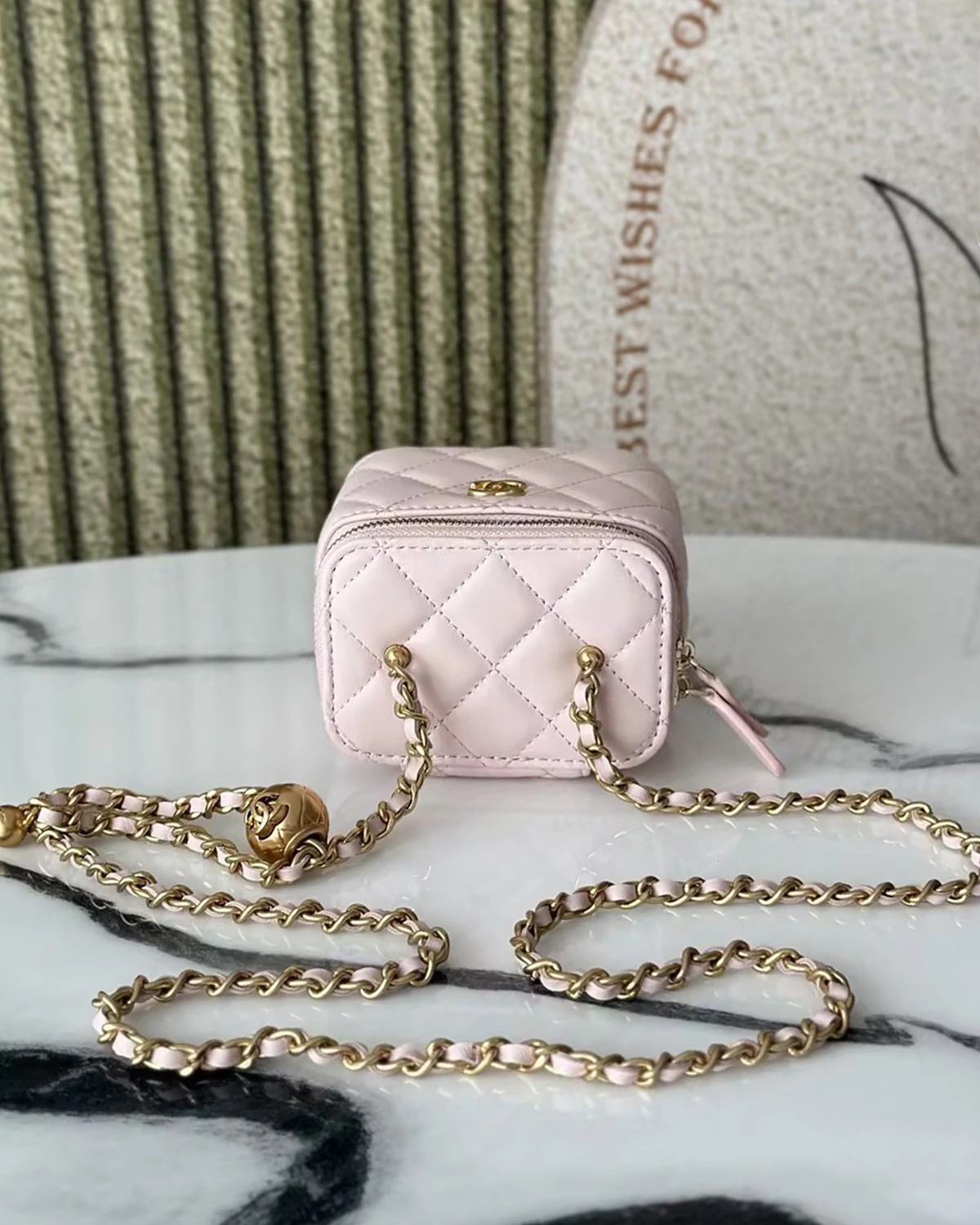 Autumn/Winter New Arrival: A unique design concept; this makeup box creates the perfect vacation vibe. Perfect for touch-ups when out and about. Made of 3D original lambskin. The adjustable chain with small gold balls greatly enhances the bag's cuteness. Exquisite and unique, it looks fantastic when worn.