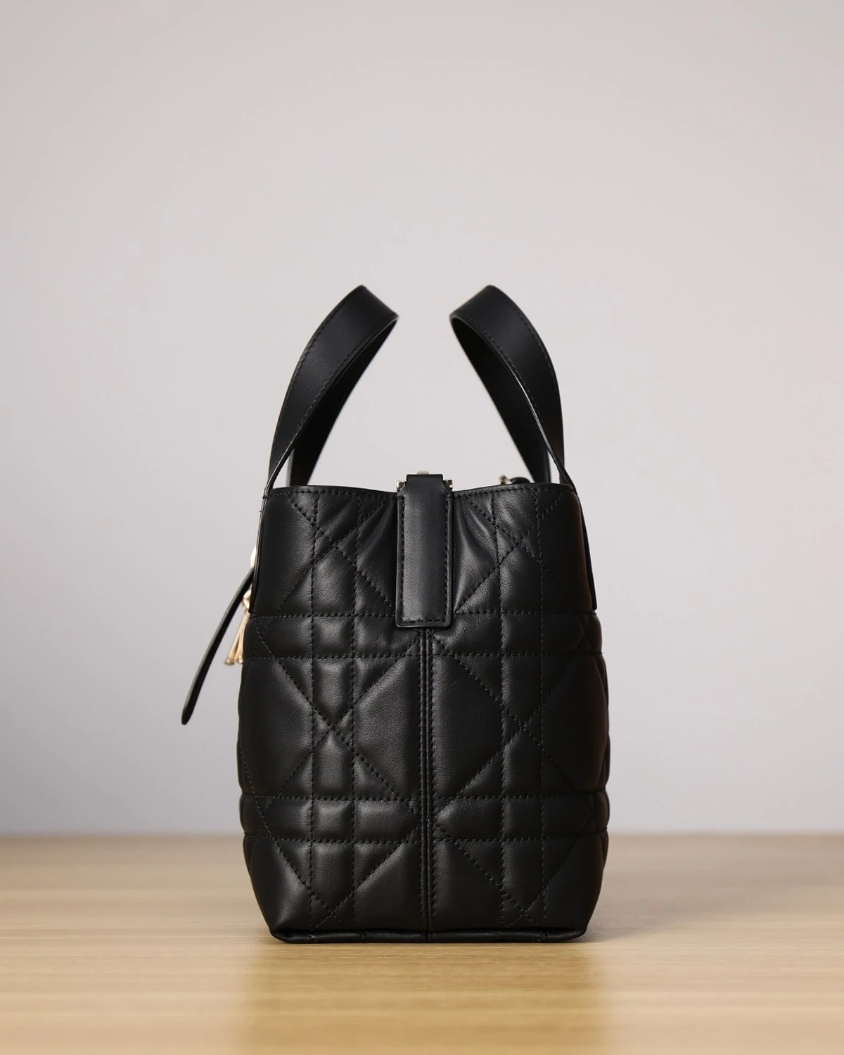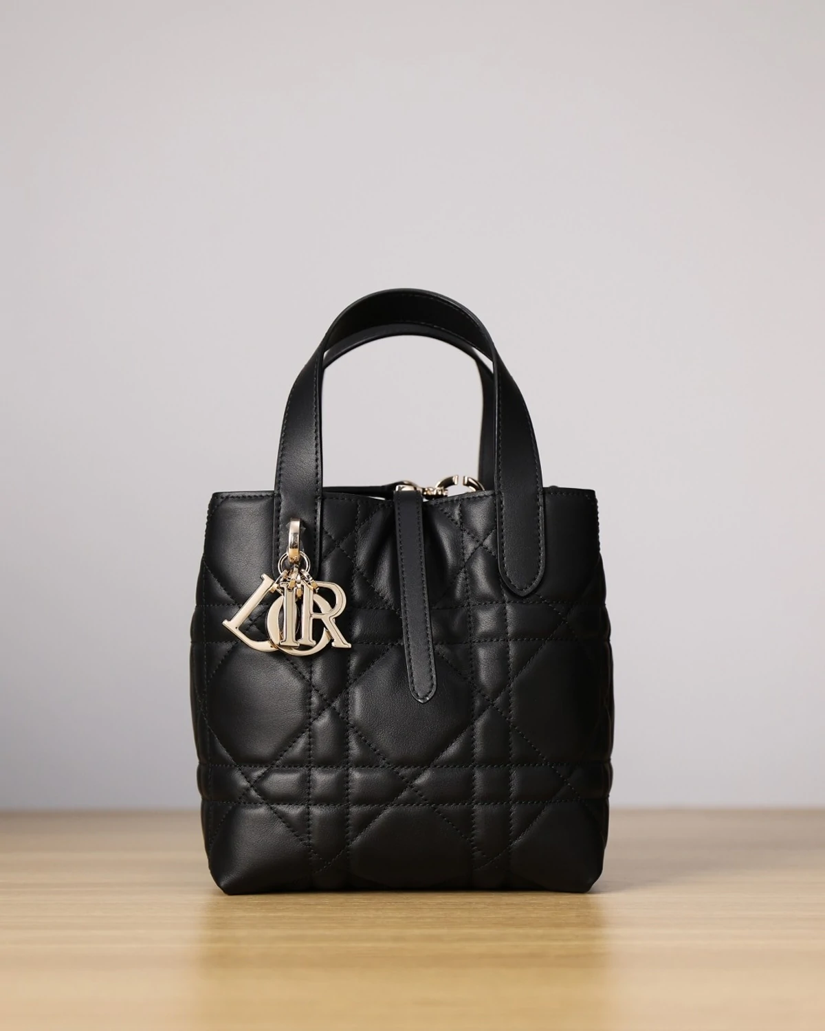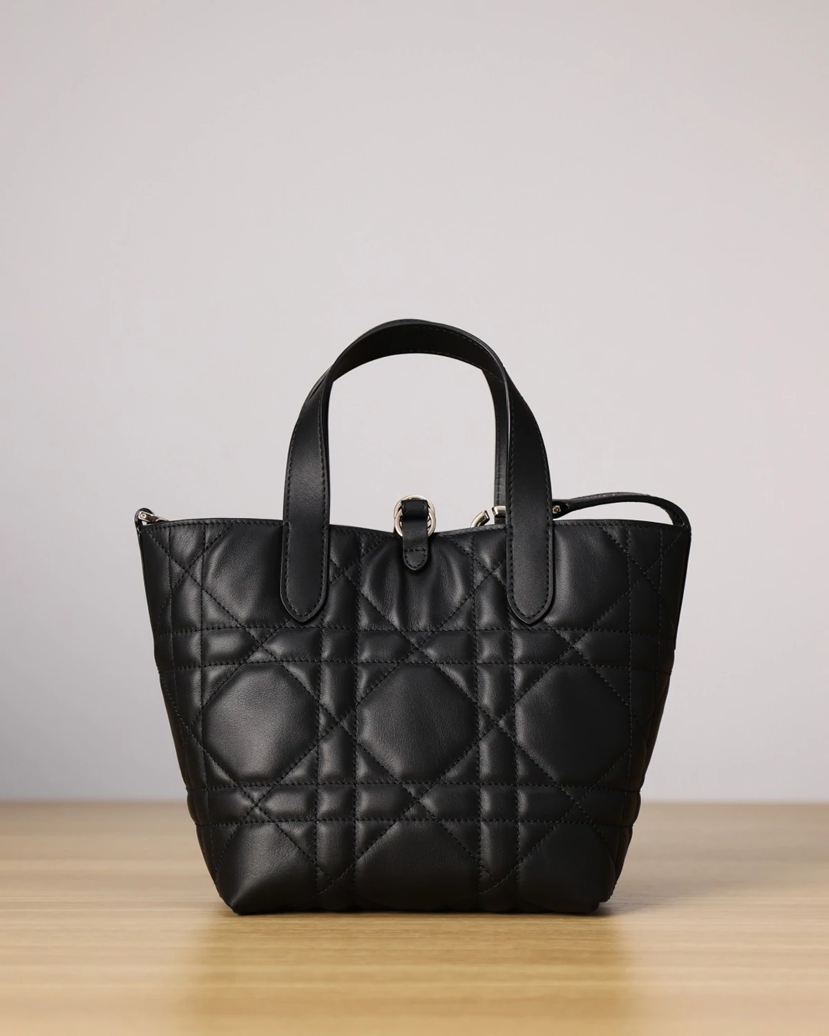 The Toujours vertical tote bag is distinguished by a modern and practical design. Crafted in black calfskin with Macrocannage topstitching, it has a spacious interior compartment to accommodate all the essentials. Its thin leather strap closure keeps items secure, while the D of the CD Lock clasp twists to adjust the sides and enhance the bag's silhouette. The leather top handles are completed by a removable leather strap, allowing the small bag to be carried by hand, worn over the shoulder or crossbody.