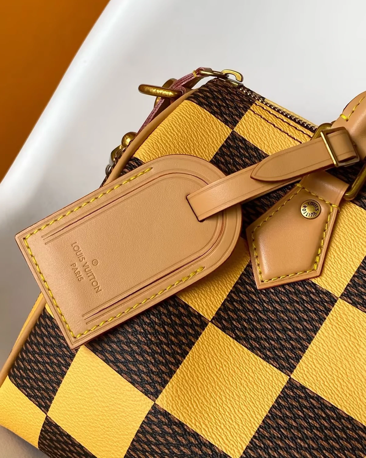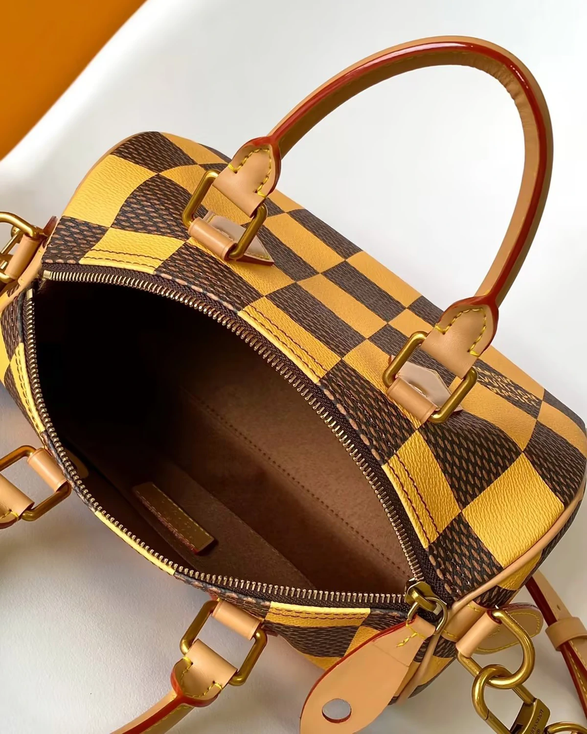 This is a Speedy 25 Bandoulière “Damier Yellow”. This bag is crafted of supple Damier Pop coated canvas in yellow and brown. The bag features vachetta top handles, trim, aged gold hardware, and an optional shoulder strap. The top zipper opens to a brown fabric interior with a patch pocket.