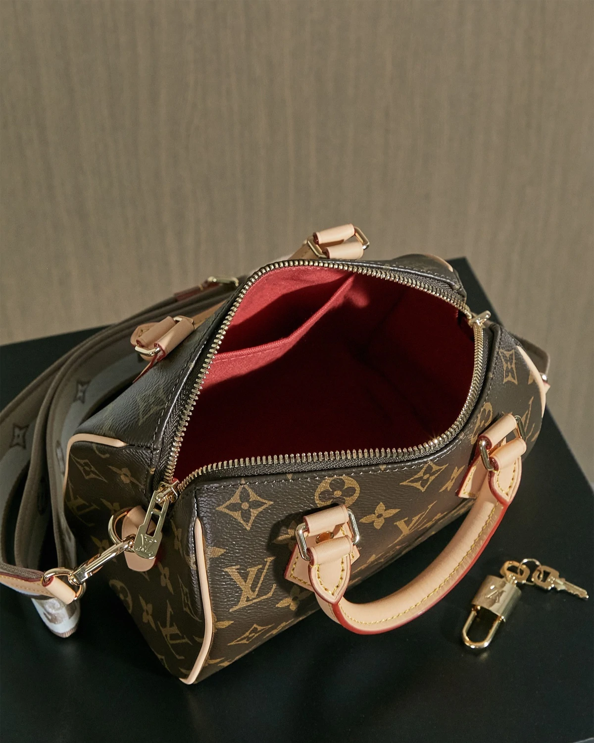 The Speedy Bandoulière 20 hand bag takes on classic Louis Vuitton allure in Monogram canvas with natural cowhide-leather trim and gold-color hardware. Inspired by the House’s emblematic travel bag, its distinctive shape is adorned with two rolled-leather top handles, padlock. A detachable two-color strap, signed Louis Vuitton, enables shoulder and cross-body wear.