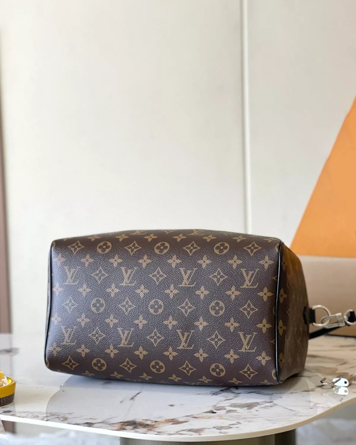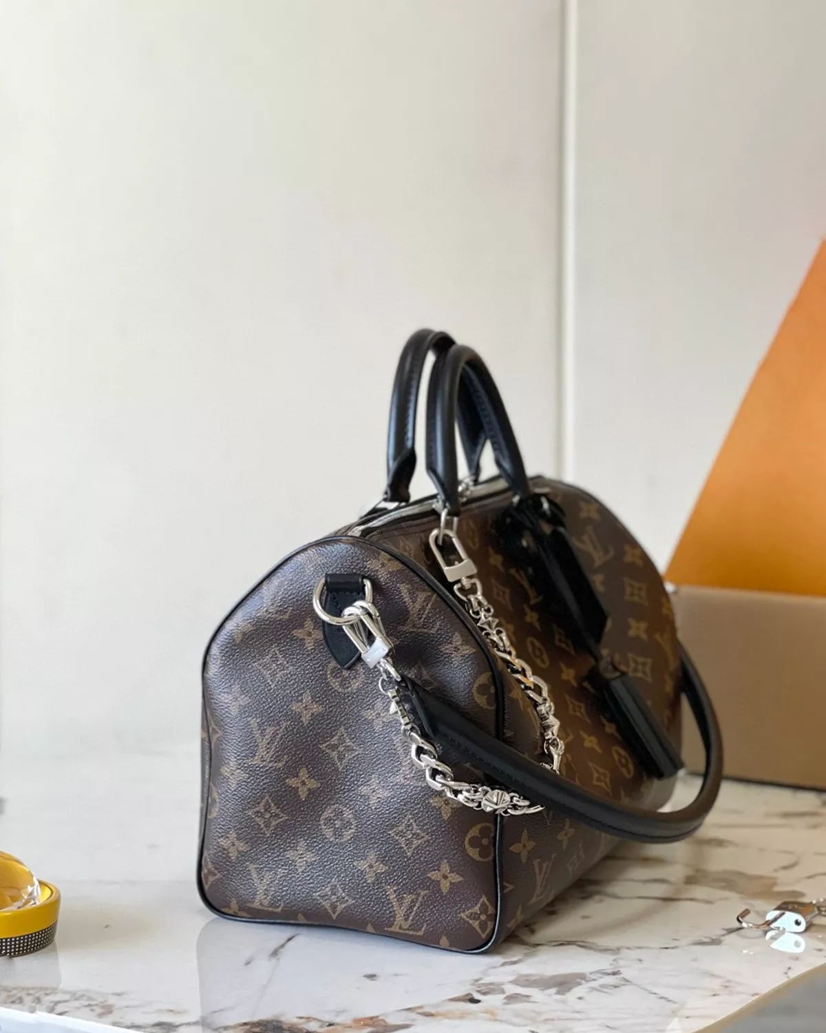Make a bold style statement with the rebce Speedy Soft 30 “Dark Edition”, a modern twist on the classic travel bag. Crafted from Monogram Black coated canvas with sleek leather trims and lining, this bag exudes confidence and edge. Its standout details include a gothic-inspired chain, name tag, and tassel, paired with a Toron handle for comfortable carry. The spacious interior, featuring a zipped pocket, fits all your essentials from a 9-inch tablet to sunglasses and wallet, making it both chic and practical for everyday or travel use.