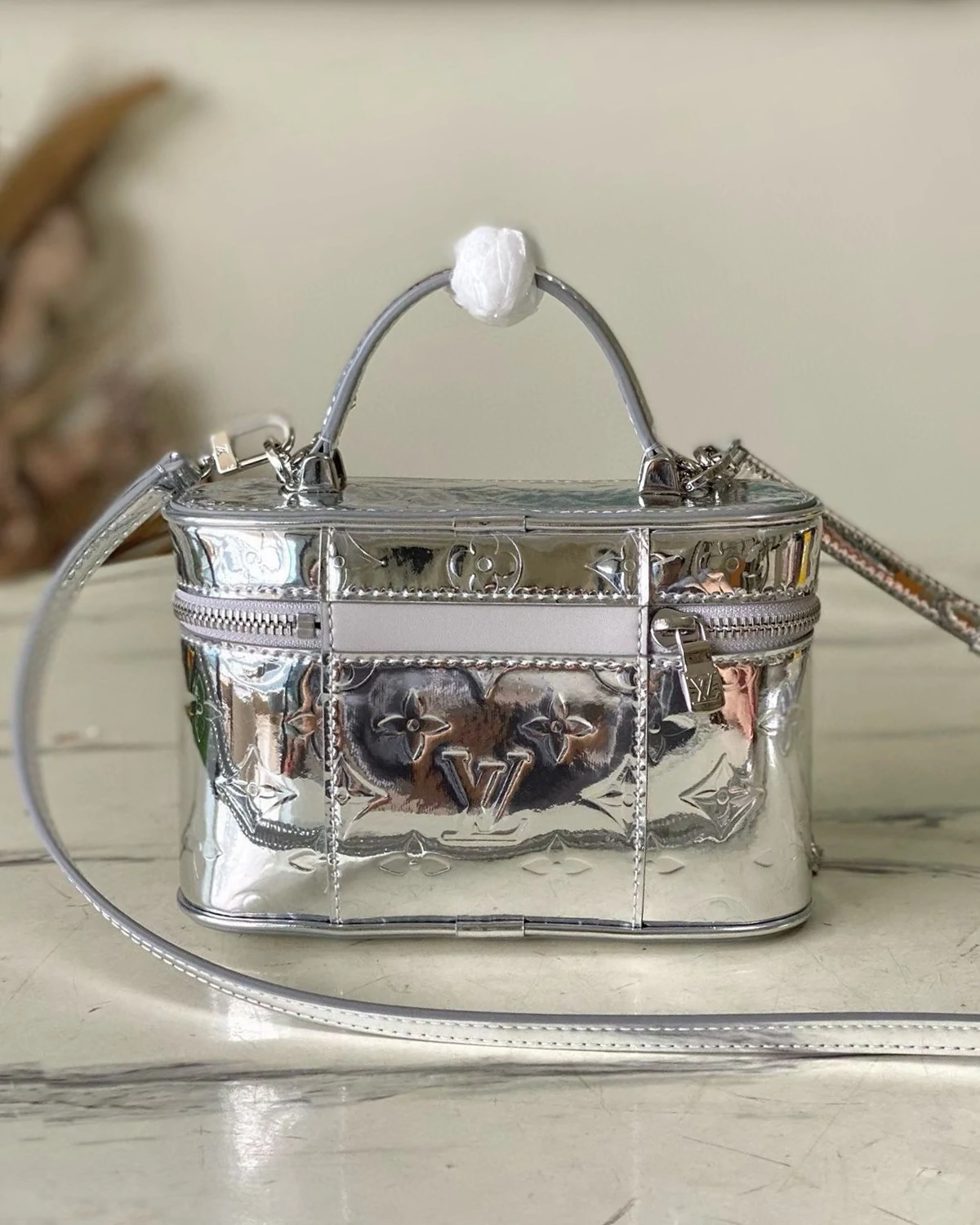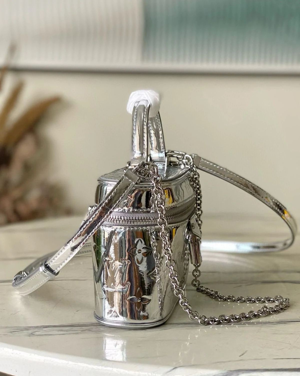 Inspired by traditional trunks, the Vanity Chain Pouch embodies the brand's travel spirit. This Ski bag is crafted from stylish silver Monogram Miroir canvas and adorned with the collection's signature engraved padlock. Functional features include a detachable shoulder strap and chain strap, providing space for essentials such as a small coin purse and sunglasses.