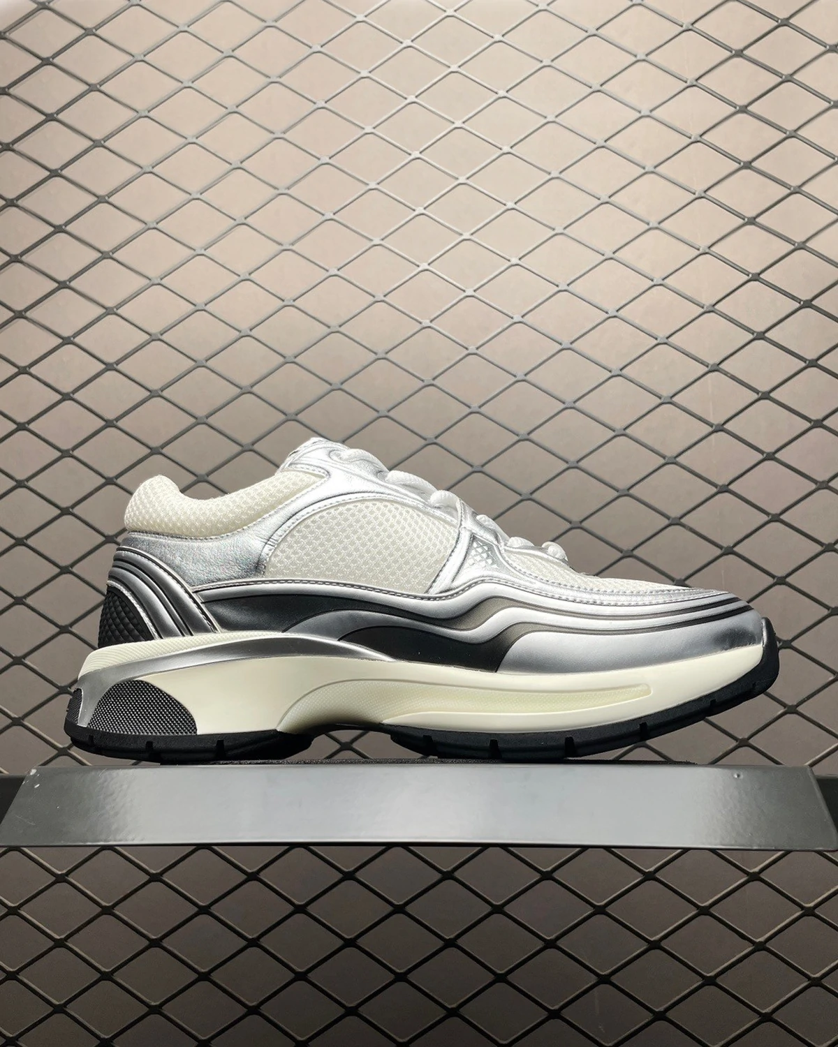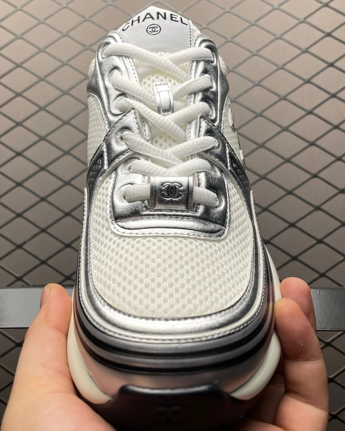 CC Logo sneakers feature a white upper accented with silver details, exuding simple elegance and showcasing exceptional taste. The classic double-C logo adds a touch of understated luxury, while the comfortable leather upper and durable sole make them suitable for various occasions. Perfectly blending style and comfort, these versatile shoes are an indispensable addition to your shoe collection.