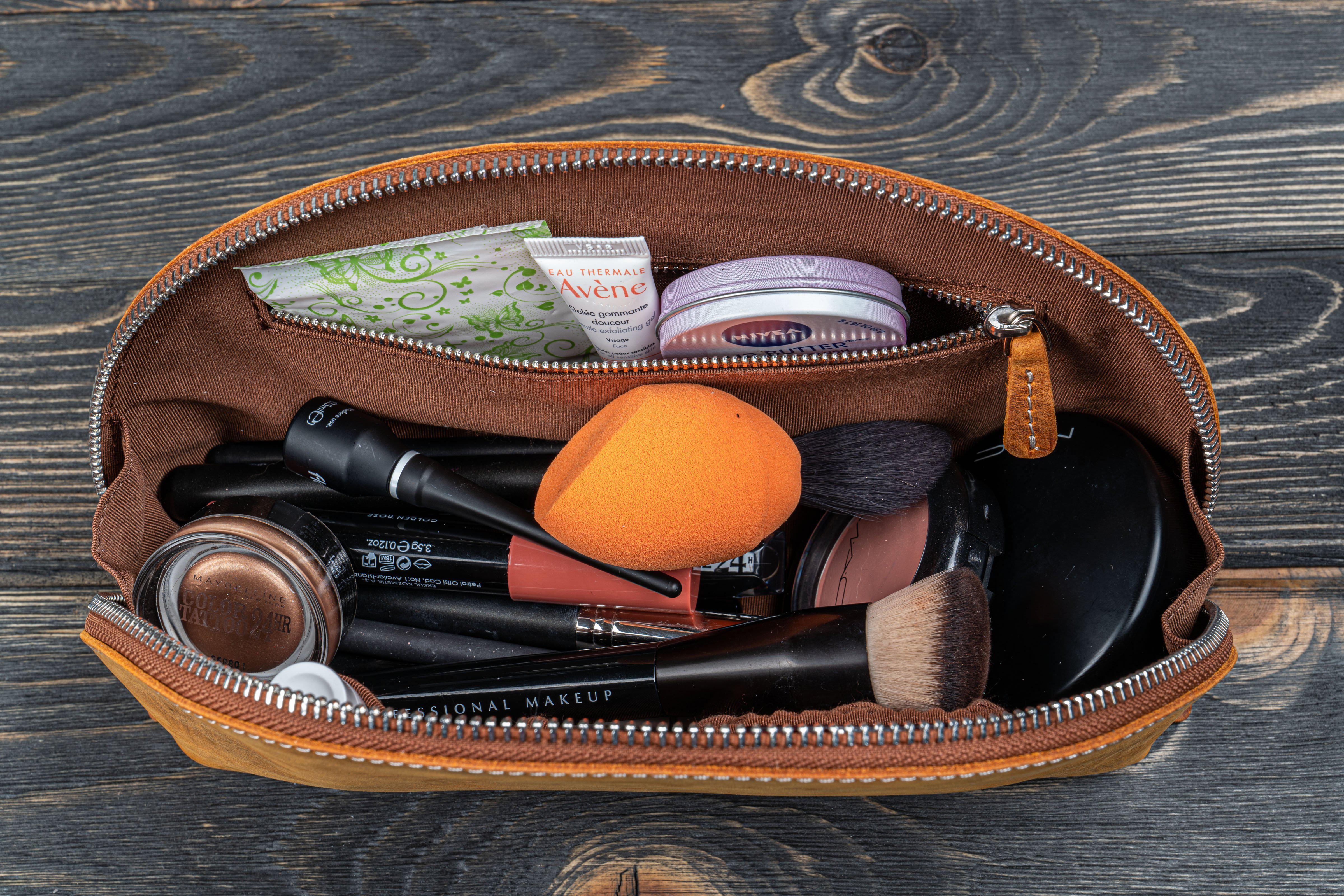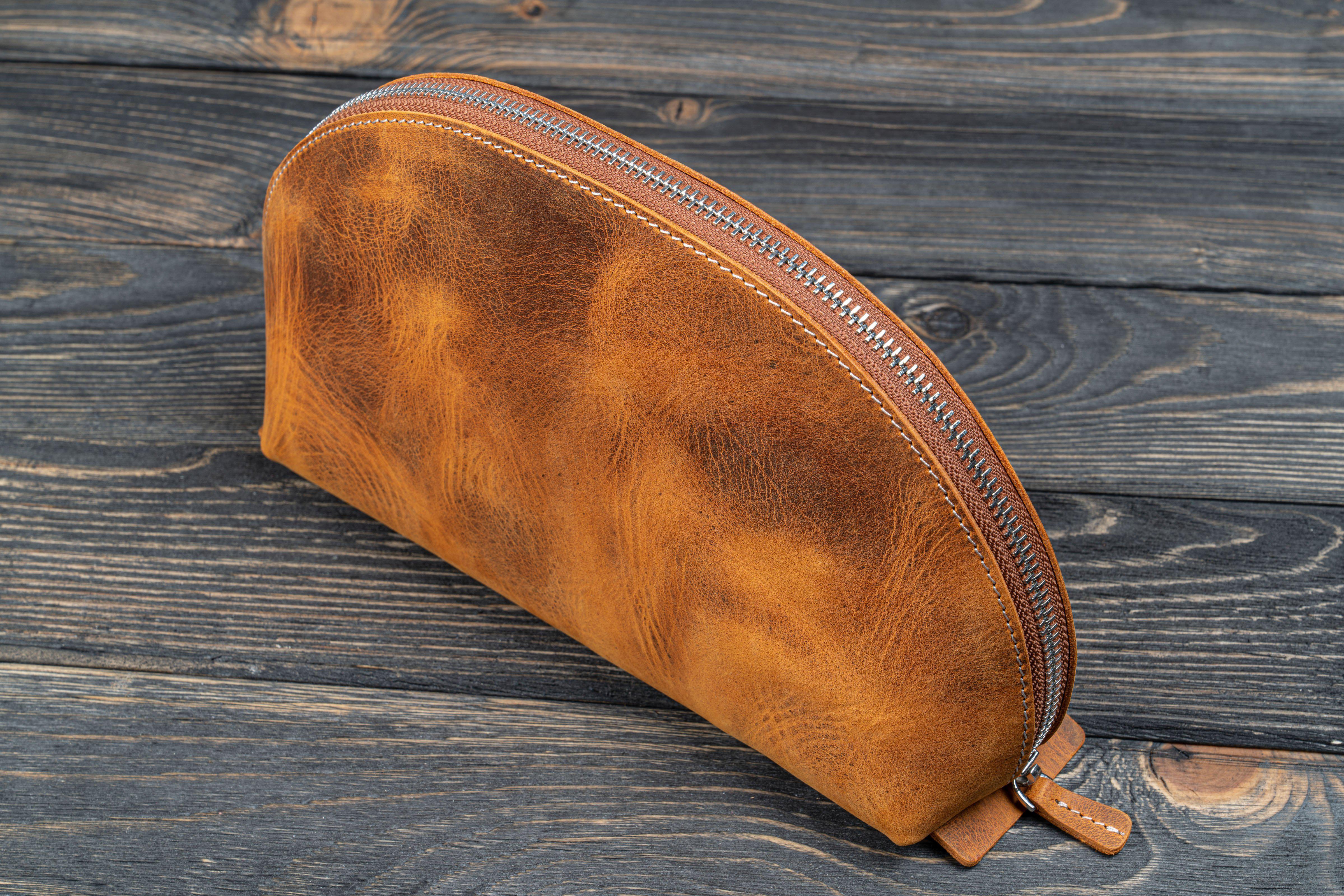 Keep your cosmetics organized with our Handmade Crazy Horse Brown Grey Leather Lunar Makeup / Toiletry Bag. This makeup bag is perfect for storing all your cosmetics and everyday bathroom accessories. Features include an internal elastic large pouch, 2 narrow elastic pouches, one zippered pocket and a flat-bottom design that allows the bag to retain its shape. Say goodbye to the cheap makeup bags that do nothing to protect or secure your precious items. With our high-quality leather makeup bags, you'll be travelling the world in style knowing you have a long-lasting companion. It's fast becoming one of our most popular leather goods and used for more than just a makeup bag.