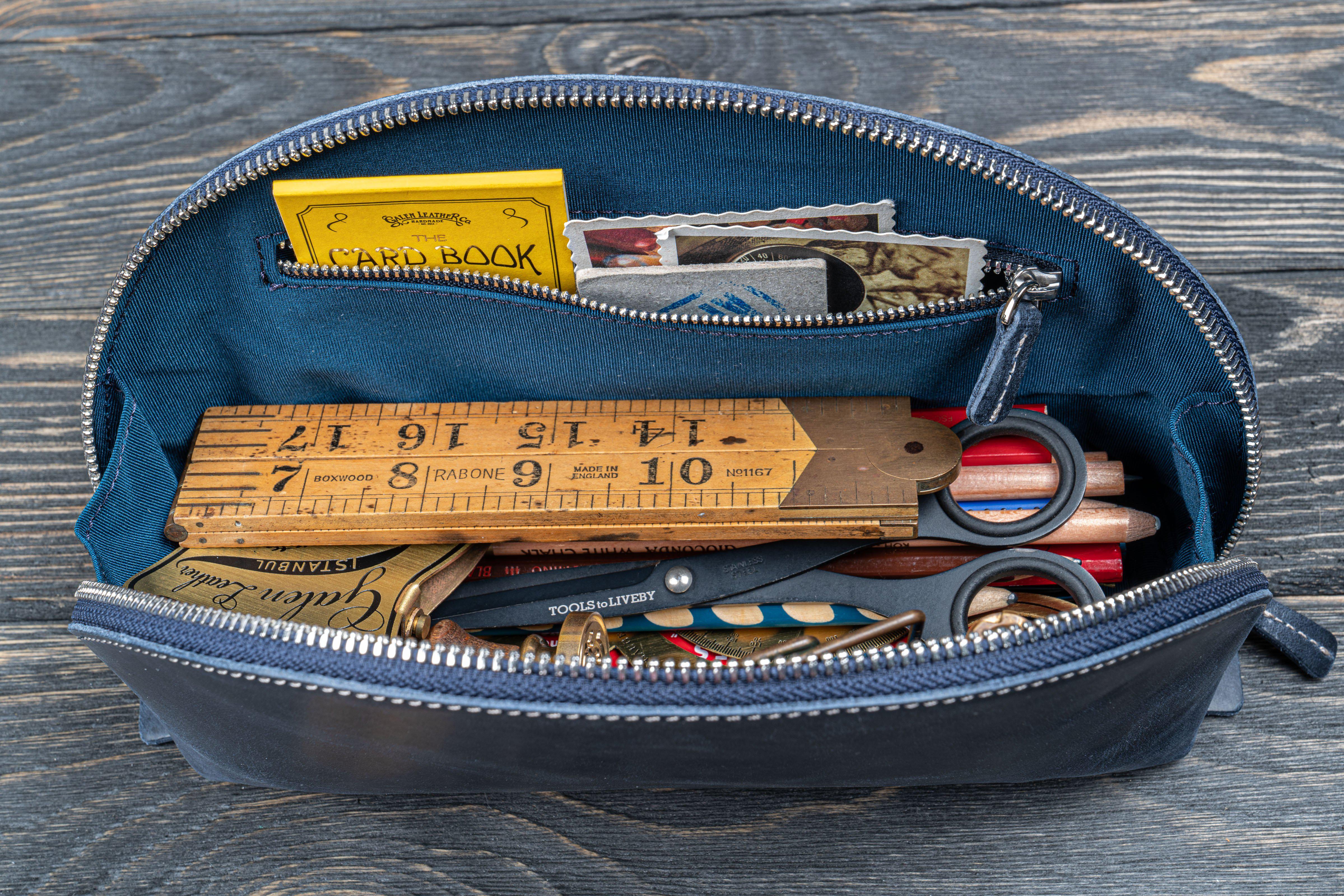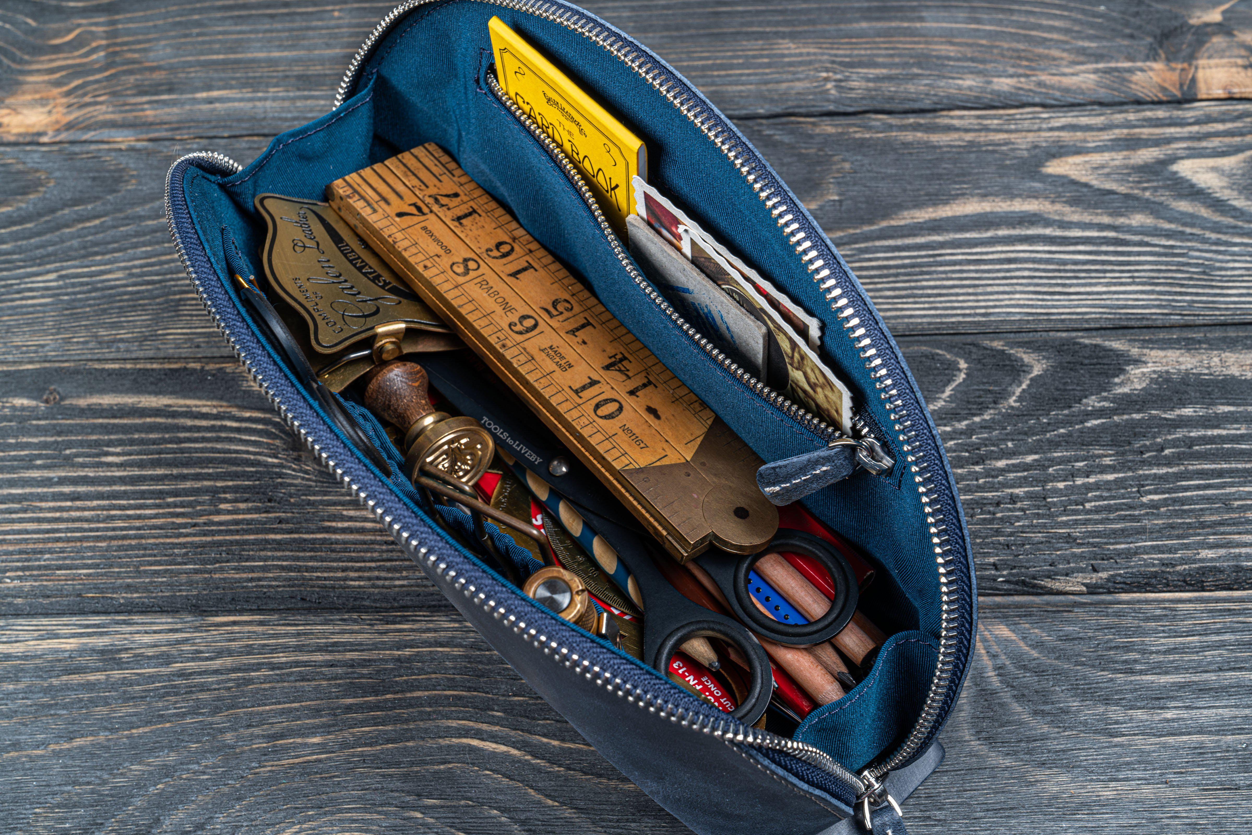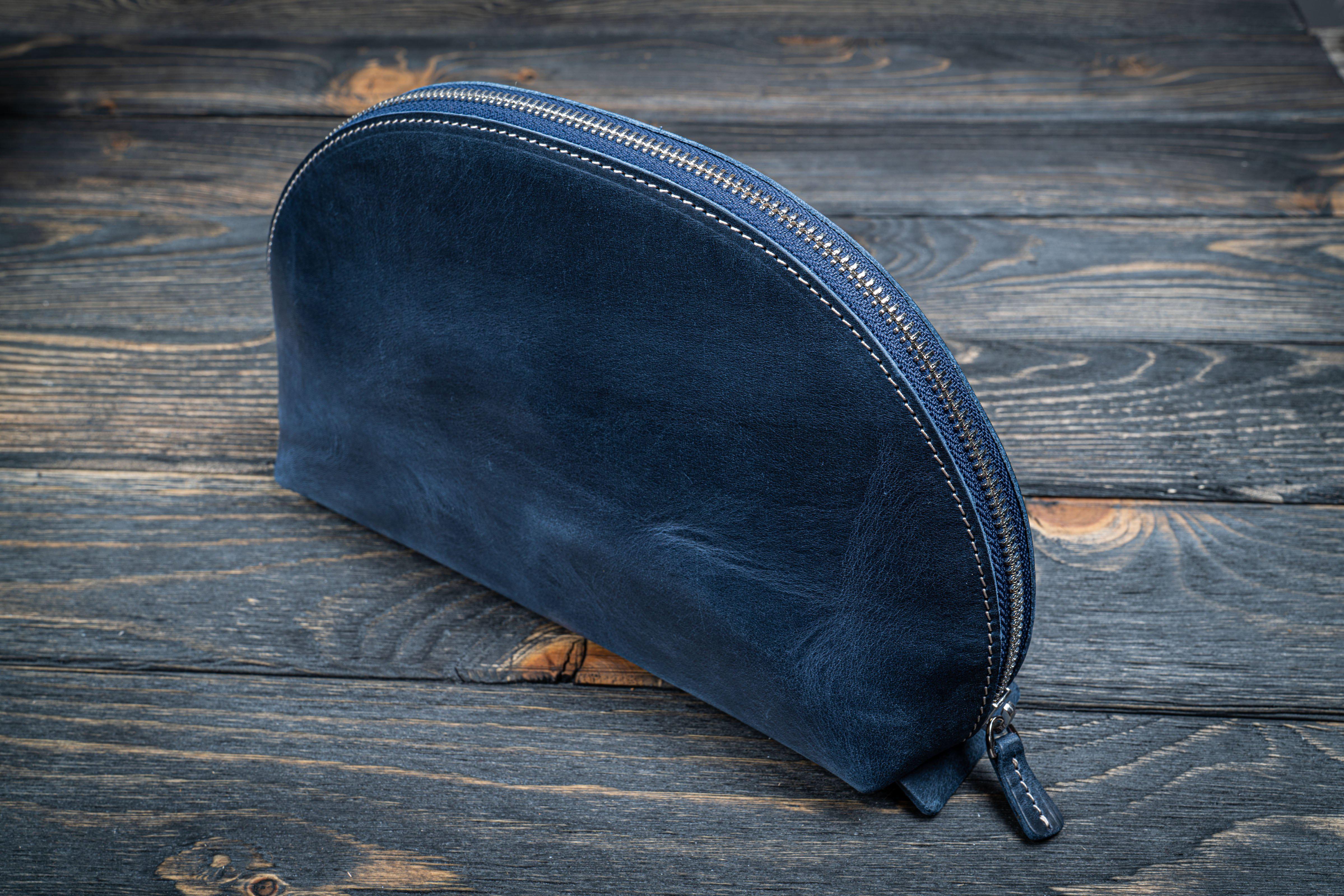 Keep your cosmetics organized with our Handmade Crazy Horse Navy Blue Leather Lunar Makeup / Toiletry Bag. This makeup bag is perfect for storing all your cosmetics and everyday bathroom accessories. Features include an internal elastic large pouch, 2 narrow elastic pouches and one zippered pocket. Say goodbye to the cheap makeup bags that do nothing to protect or secure your precious items. With our high-quality leather makeup bags, you'll be travelling the world in style knowing you have a long-lasting companion.