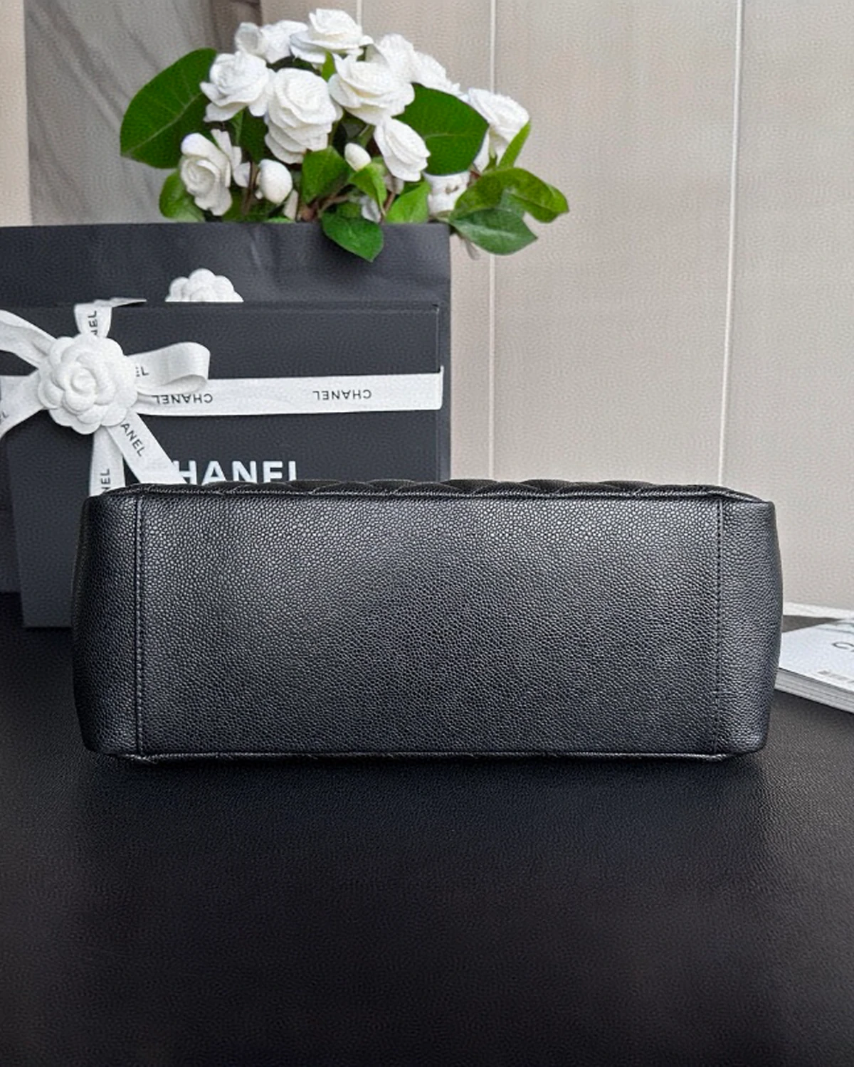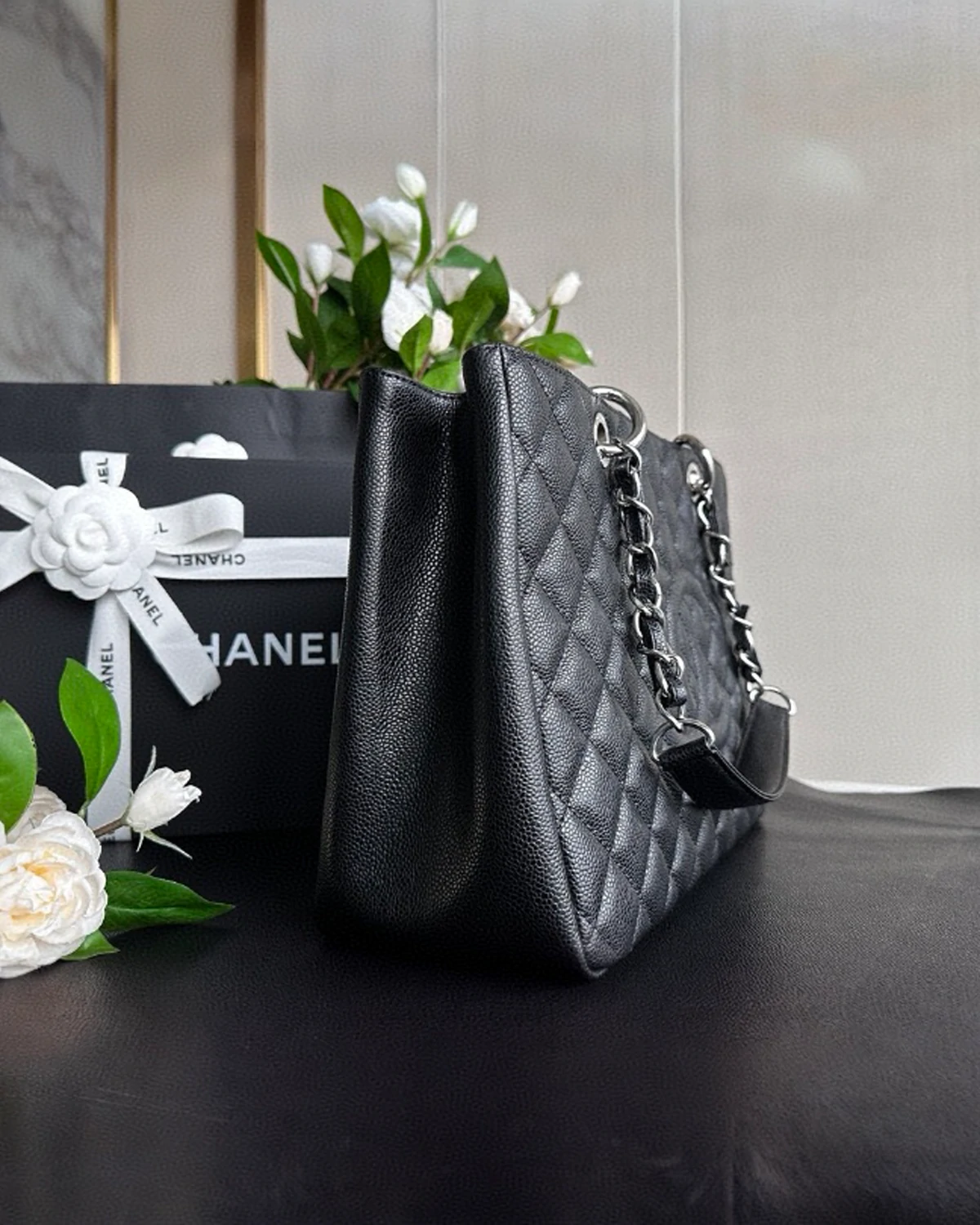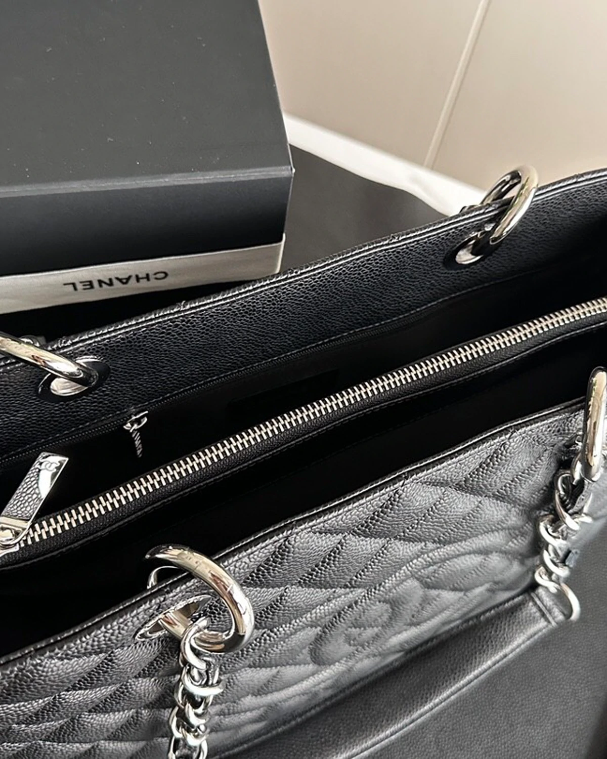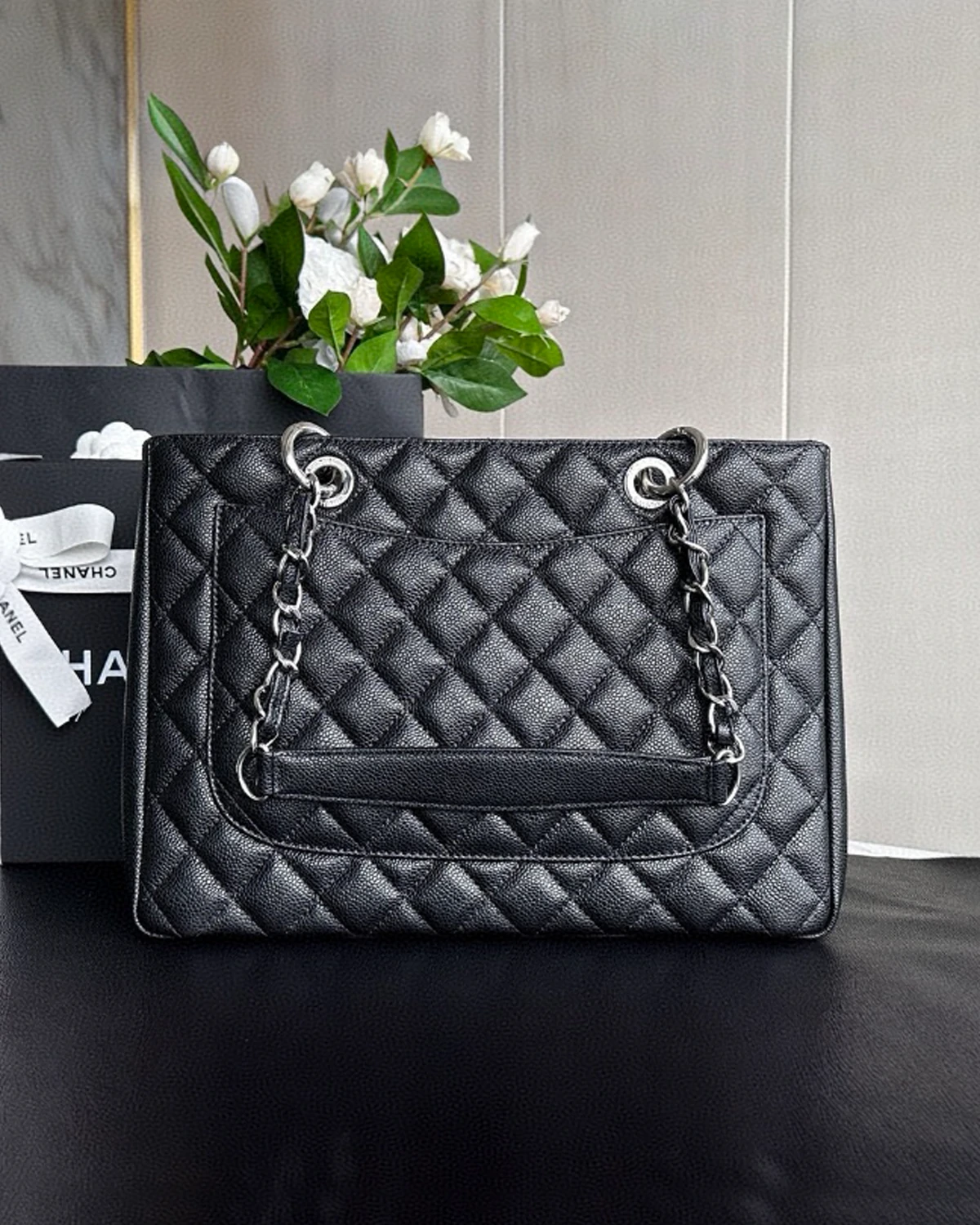 • Model: Grand Shopping• Color: Black• Size: 13″ × 9″ × 5.25″ (Length × Height × Width)• Material: Caviar leather• Hardware: Silver-tone hardware
