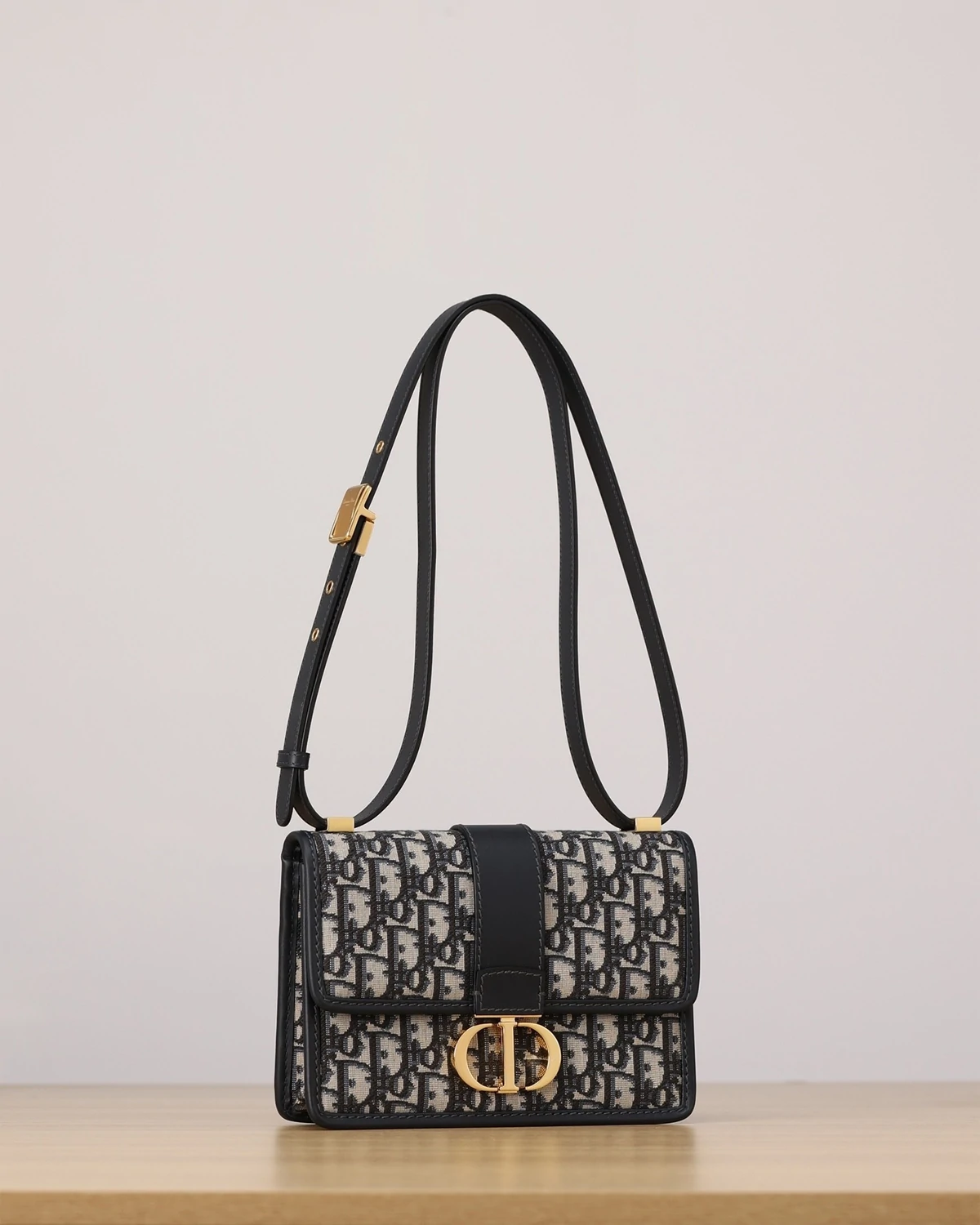 The bag enhances the 30 Montaigne line with a timeless and elegant design crafted in blue Dior Oblique jacquard. The flap has a gold-finish metal CD clasp, inspired by the seal of a Christian Dior perfume bottle. Other details, like the embossed 30 Montaigne signature on the back and the military-inspired buckle, highlight the streamlined design. Featuring an adjustable leather strap, the small 30 Montaigne bag can be carried by hand, worn over the shoulder or crossbody.