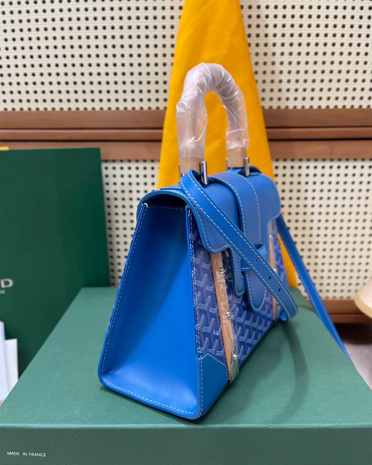 The Saïgon Structuré PM Bag – Sky Blue presents a refined balance of heritage craftsmanship and modern elegance. Its structured silhouette is enhanced with signature trunk-inspired elements, including wooden side batons, leather-reinforced corners, metallic rivets, and a sculpted beechwood top handle.