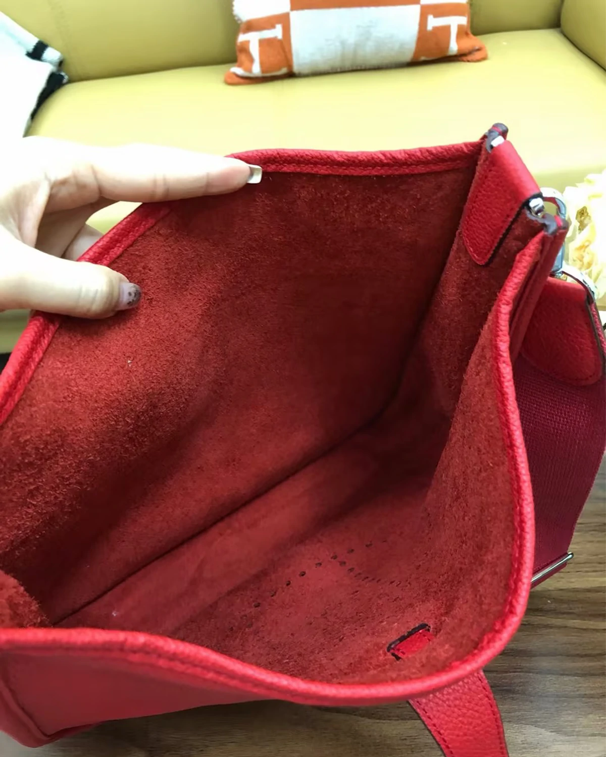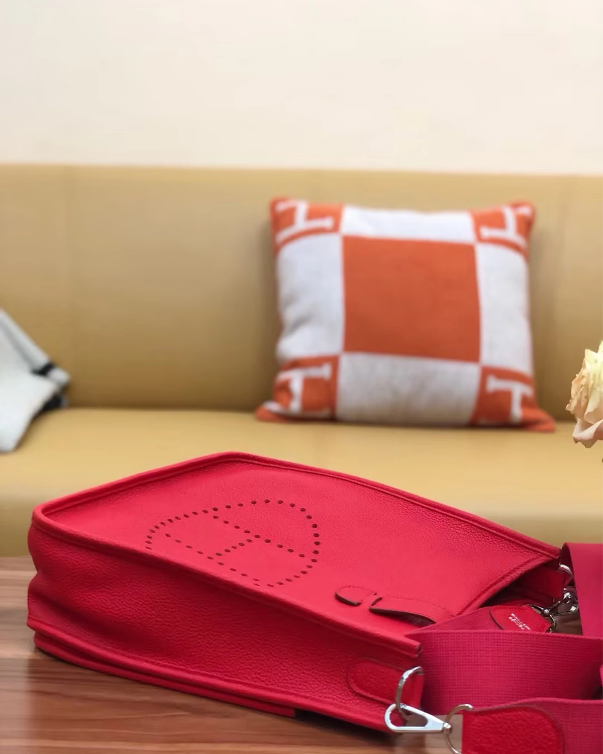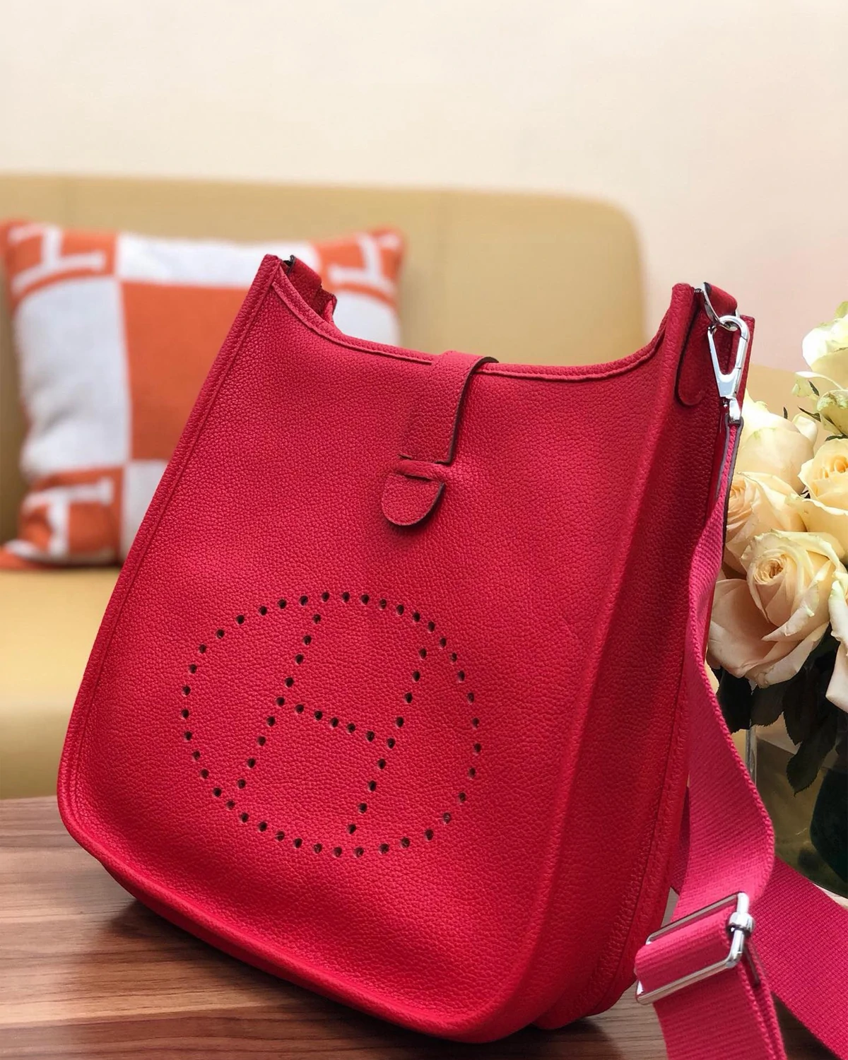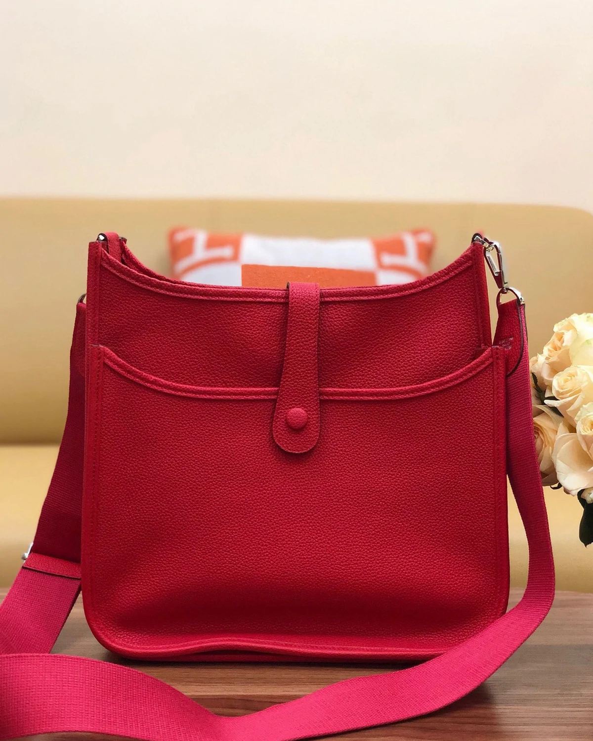 This bag is both comfortable and stylish. Crafted from Clemence calfskin leather, this red bag features a leather flap and snap closure, and a perforated H logo on the front. It comes with an adjustable canvas shoulder strap and silver-tone hardware. The spacious suede interior holds enough for your essentials and includes a leather patch pocket.