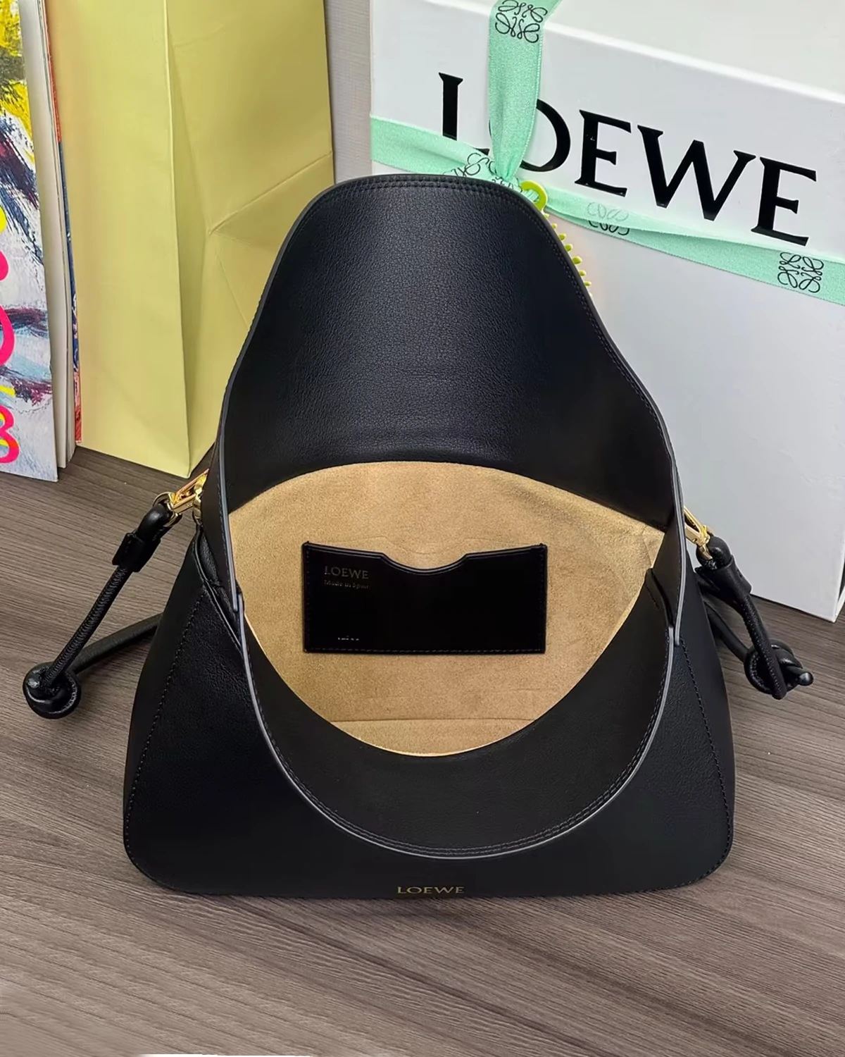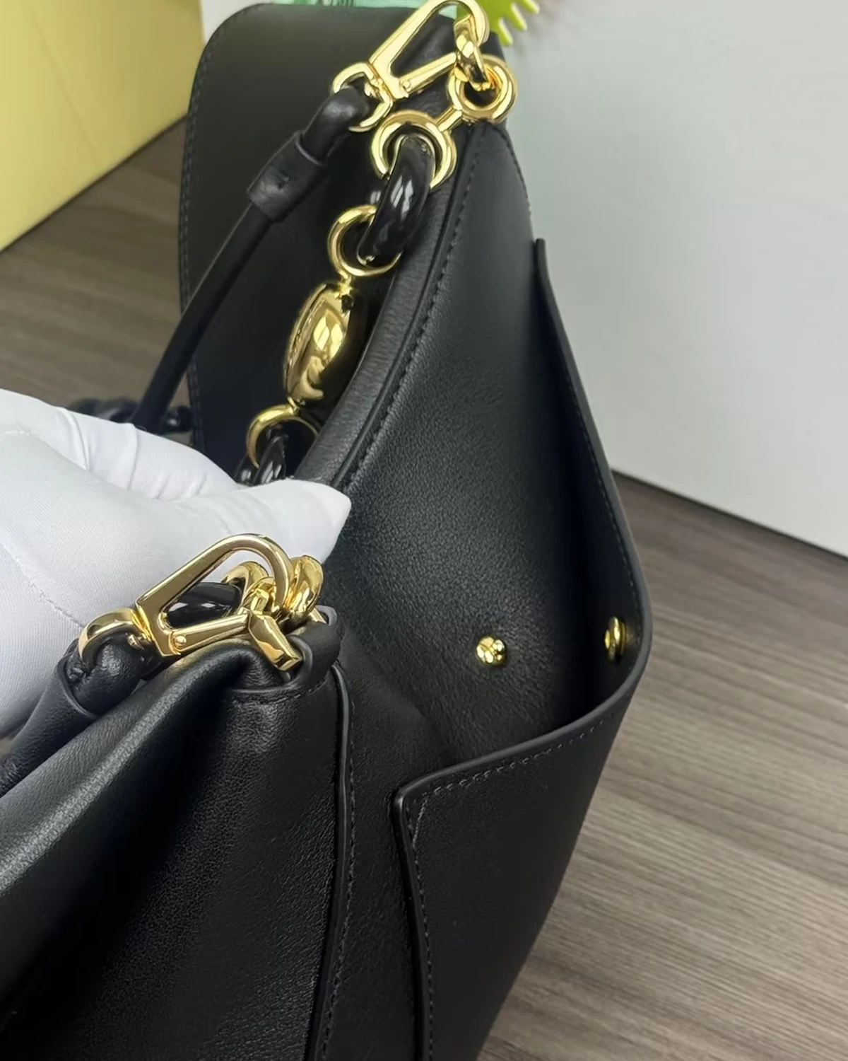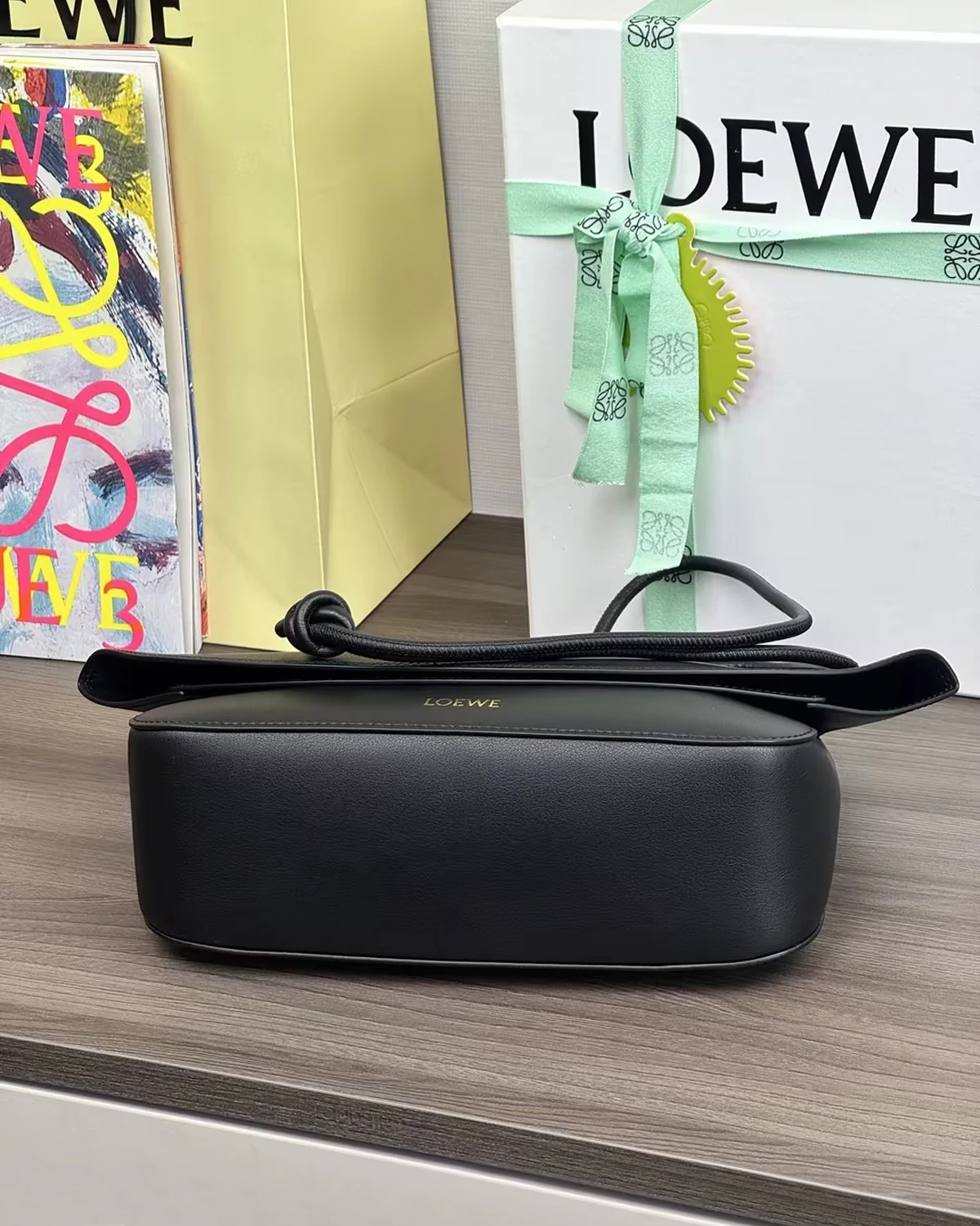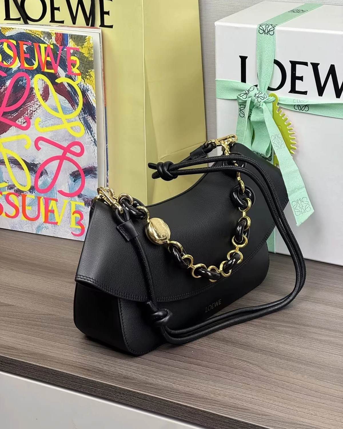 Key Features • Strap: Detachable tubular calfskin strap; detachable donut chain• Closure: Flap closure• Interior: One internal pocket• Logo: Gold embossed LOEWE, engraved Anagram• Color: Black• Metallic Color: Gold• Main Material: Smooth calfskin leather• Strap Length: 37 cm (chain) / 97–61 cm (leather strap)• Strap Drop: 15 cm (chain) / 31–56 cm (leather strap)• Weight: 0.53 kg• Height: 18 cm• Width: 26 cm• Depth: 13 cm