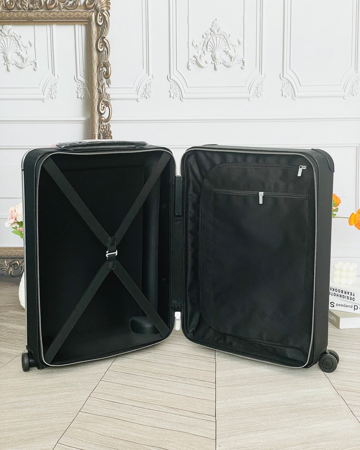 • Interior: Flat-bottomed interior; elastic straps; divider with pocket