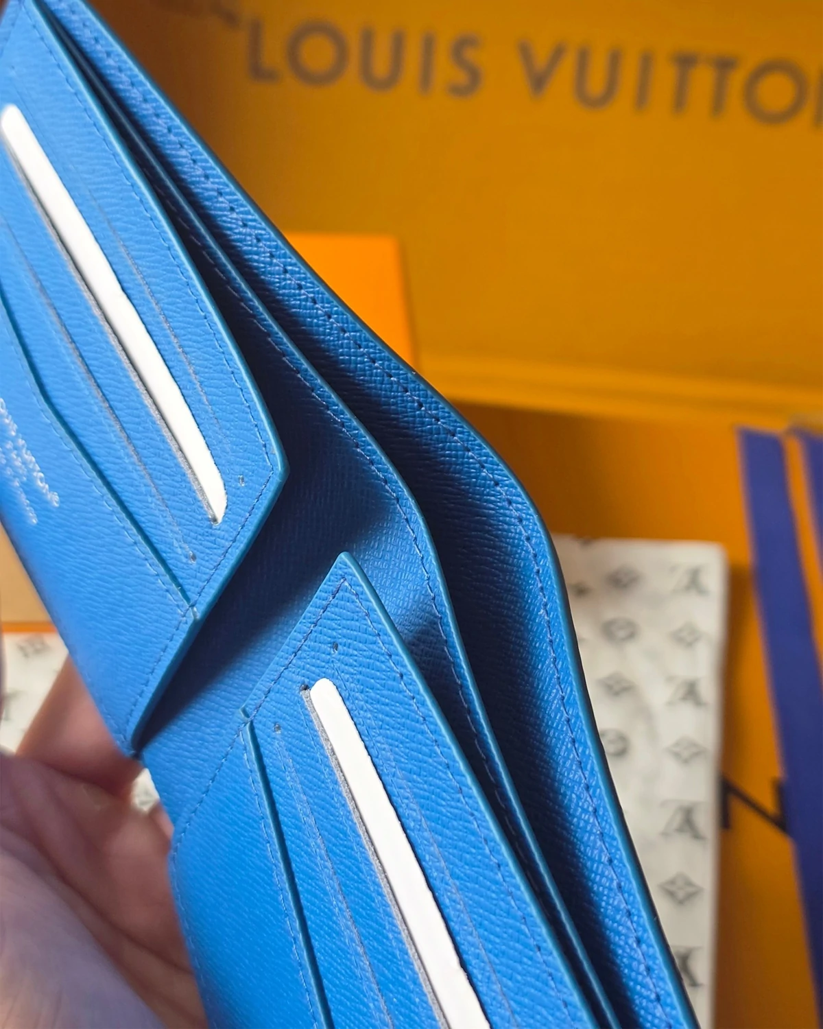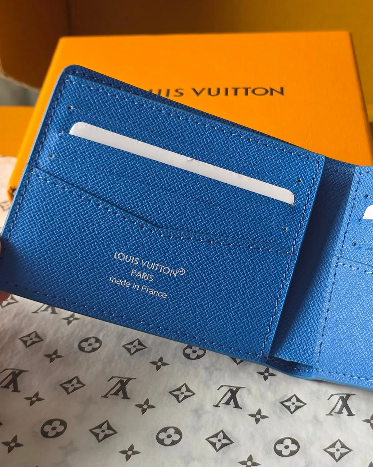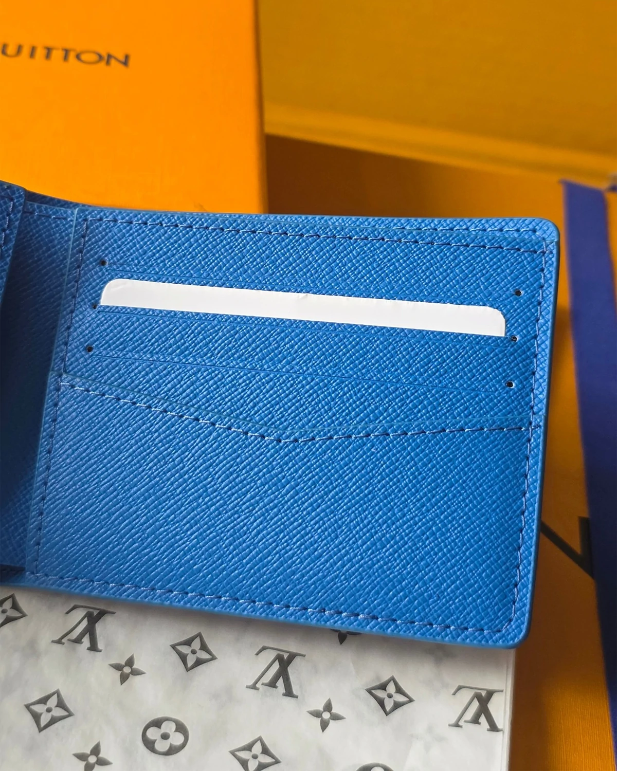 This Slender Wallet is made from colored Monogram canvas and features a playful print of a miniature sports scene, seen from the sky. The subtle Monogram pattern seems to disappear into the background color, elevating the photorealistic image. Inside, it offers eight card slots and a compartment for bills.